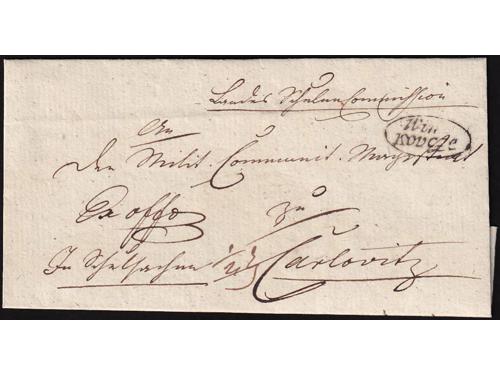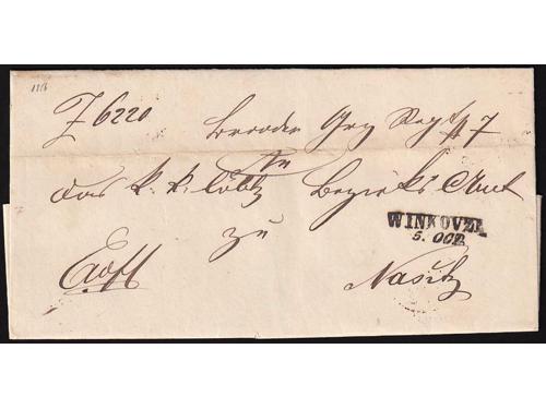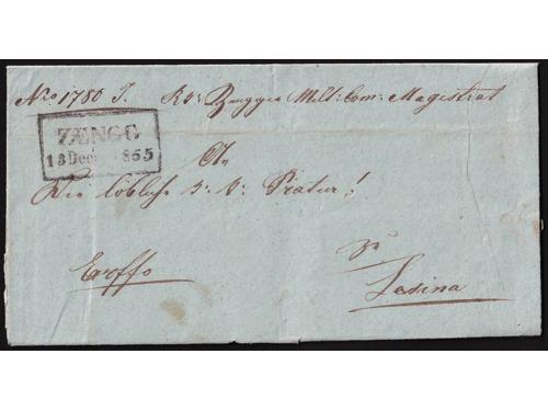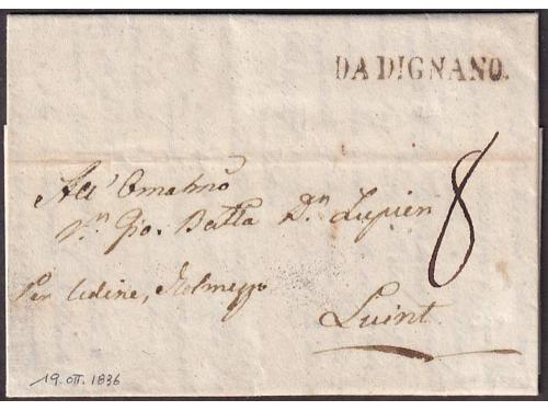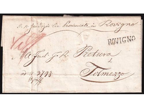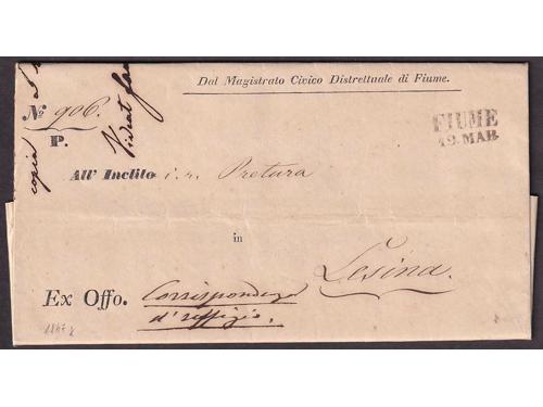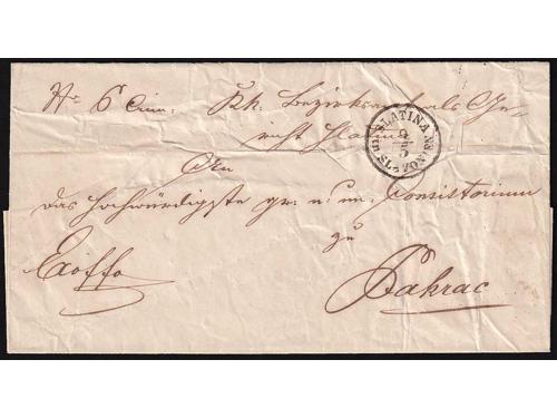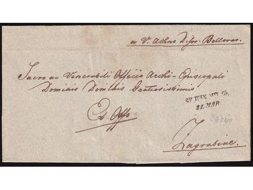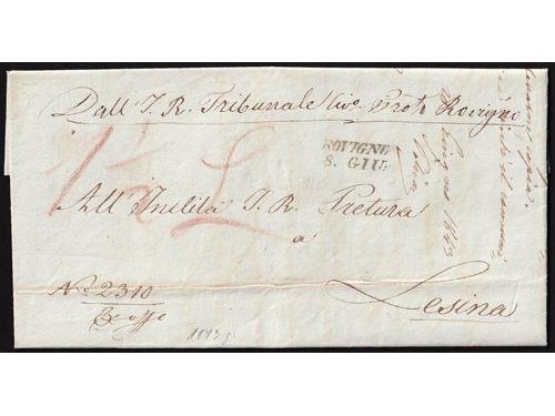 Aukcija br. 60 - Filatelija i razglednice ✉ 25 - Formular s kompletnim sadržajem upućen iz FIUME (Rijeka) u LESINA (Hvar) 19.03. 1847. 20 EUR ✉ 26 - Pismo s kompletnim sadržajem upućeno iz ROVIGNO (Rovinj) u Tolmezzo 26.09. 1826. 60 EUR ✉ 27 - Pismo s kompletnim sadržajem upućeno iz ROVIGNO (Rovinj) u LESINA (Hvar) 1843 godine. 40 EUR ✉ 28 - Pismo s kompletnim sadržajem upućeno iz ZENGG (Senj) u LESINA (Hvar) 13.12. 1855. 30 EUR ✉ 29 - Pismo malog formata s kompletnim privatnim sadržajem upućeno iz Šibenika 1821. 25 EUR ✉ 30 - Pismo s kompletnim sadržajem upućeno iz SCRADONA (Skradin) preko SEBENICO (Šibenik) u DERNIS (Drniš) 1865. 16 EUR ✉ 31 - Omot pisma upućeng iz Slatine preko Našica, Požege, Nove Gradiške i Okučana u Pakrac 1860 godine. 18 EUR ✉ 32 - Omot pisma upućenog iz SZ.IVAN.MIL.GR (Sveti Ivan Žabno) u Zagreb. 25 EUR ✉ 33 - Pismo s kompletnim sadržajem upućeno iz Valpova u Našice preko Bizovca 08.08.1839. 20 EUR ✉ 34 - Pismo s kompletnim sadržajem upućeno iz WINKOVCZE (Vinkovci) u CARLOVITZ (Srijemski Karlovac) 1839. 20 EUR ✉ 35 - Pismo s kompletnim sadržajem upućeno iz WINKOVZI (Vinkovci) u Našice preko Osijeka 05.10. 1856. 20 EUR ✉ 36 - Pismo malog formata s kompletnim sadržajem upućeno iz DA DIGNANO (Vodnjan) u Luint 19.10. 1836. 60 EUR ←123456789→