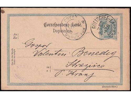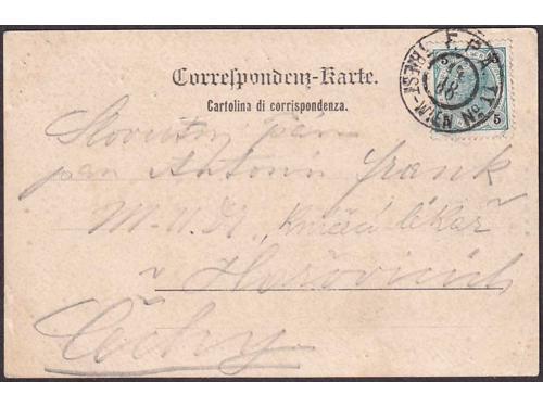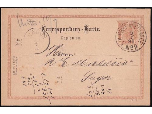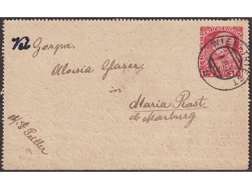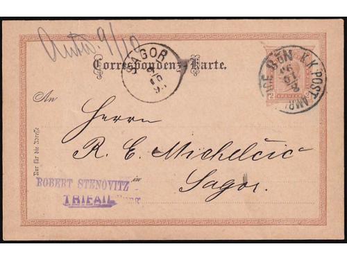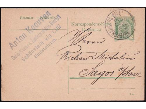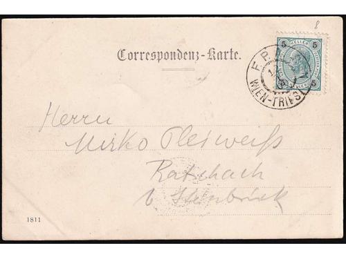 Aukcija br. 60 - Filatelija i razglednice Slovenija ✉ 776 - Dopisnica dofrankirana i upućena iz Solčave u Francusku 14.08. 1902. 20 EUR ✉ 777 - Preporučeno pismo upućeno iz Divače u Sežanu 06.06. 1914. 40 EUR ✉ 778 - Dvojezična dopisnica upućena iz Maribora u Zagreb 1874. 14 EUR ✉ 779 - Vojnopoštansko pismo upućeno od pripadnika 94 pješačke divizije u Ljubljanu. 16 EUR ✉ 780 - Dva odgovora zarobljeničkih karata upućenih iz Ljubljane u logor u Taškentu 1917. 14 EUR ✉ 781 - Dopisnica poništena lijepim otiskom žiga K.K. POST AMBULANCE No. 9 i upućena u Sagor 09.07. 1891 25 EUR ✉ 782 - Dopisnica poništena žigom K.K. POST AMBULANCE No. 8 i upućena u Sagor 08.10. 1893 14 EUR ✉ 783 - Dopisnica upućena prugom GOTTSCHEE-LAIBACH 332 u Stražišće 10.07. 1904. 16 EUR ✉ 784 - Dopisnica upućena prugom UNTERDRAUBURG-CILLI u Sagor. 16 EUR ✉ 785 - Razglednica Maribora upućena prugom WIEN-TRIEST u Zidani Most 12.01. 1900. 16 EUR ✉ 786 - Razglednica Trsta upućena prugom TRIEST-WIEN No. 11 u Češku 14.10. 1900. 12 EUR ✉ 787 - Zatvorena dopisnica upućena prugom WIEN-TRIESTE 8 u Maria Rast kod Maribora 18.11. 1910. 12 EUR ←123456789→