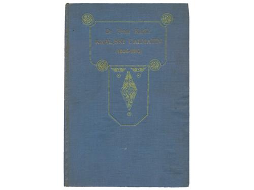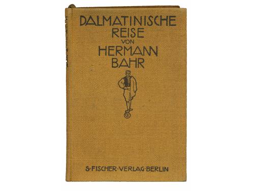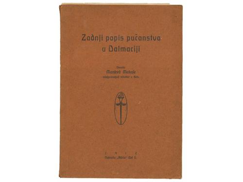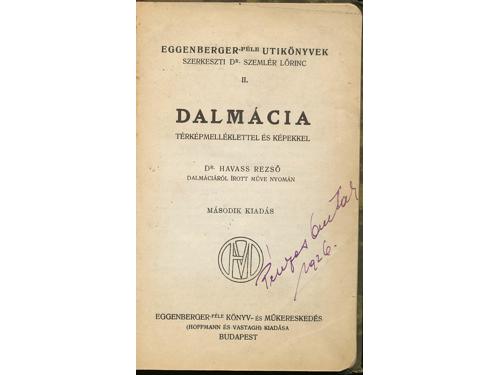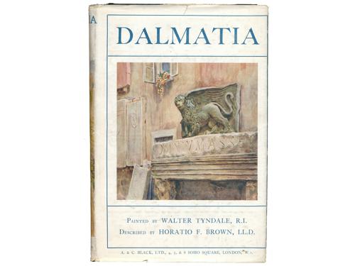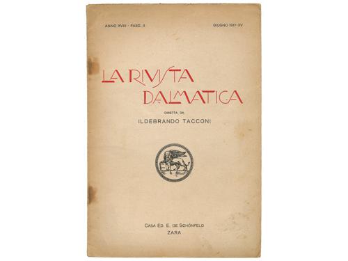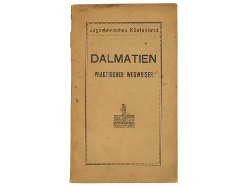 Aukcija br. 65 - Knjige, zemljovidi, plakati 1117 - Maude M. Holbach: Dalmatia, London 1908. 90 EUR 1118 - Petar Karlić: Kraljevski Dalmatin (1806. – 1810.). Zadar: Matica dalmatinska, 1912. 35 EUR 1119 - Manfred Makale: Zadnji popis pučanstva u Dalmaciji. Beč, Adria 1912. 60 EUR 1120 - Pierre Marge: Voyage en Dalmatie, Bosnie-Herzegovine et Montenegro, Paris: Librarie Plon, 1912. 40 EUR 1121 - Hermann Bahr: Dalmatinische Reise. Berlin, S. Fischer 1912. 22 EUR 1122 - JELŠA. Führer durch die Insel Hvar - Lesina. Hotel Jadran und sein Seebad Dražica Mina. Zara, Buchdruckerei Schönfeld & C.o 1913. 40 EUR 1123 - Dalmatien – Praktischer Wegweiser. Split, Putnički ured 1914. 35 EUR 1124 - Horatio F. Brown: Dalmatia, painted by Walter Tyndale, London: A&C Black Ltd, 1925. 35 EUR 1125 - Rezso Havass: Dalmacia. Budimpešta 1926. 30 EUR 1126 - Marie-Louise Bercher: Dalmatie, invitation au voyage, Paris: Librairie Hachette, 1935. 20 EUR 1127 - Adria – Verkehr 1935 – 1936. Split, Putnik 1935. 25 EUR 1128 - La rivista dalmatica, Anno XVIII - Fasc. II, lipanj, 1937. Zara, Enrico (de) Schönfeld 1937. 25 EUR ←394041424344454647→