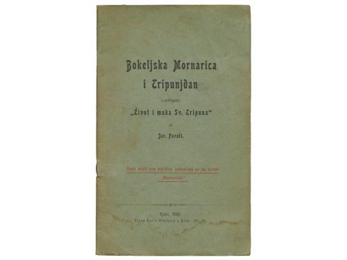 Aukcija br. 65 - Knjige, zemljovidi, plakati 1129 - Alberto Giovannini (dir.): Dalmazia. Rivista mensile, Anno I. Fascicoli II-III, Zara, 1943. 30 EUR 1130 - Franz Hermann Wills: Reisebilder aus Dalmatien. Wien, Verlag Anton Schroll 1944. 30 EUR 1131 - Christopher Sidgwick: Manhunt in Dalmatia. London, Peter Davies 1959. 20 EUR 1132 - Bill Strutton: Island of Terrible Friends. London, Hodder & Stoughton, 1961. 20 EUR 1133 - Franko Mirošević: Počelo je 1918. ... Južna Dalmacija 1918-1929. Zagreb, Školska knjiga 1992. 8 EUR 1134 - Aldo Mazza: Dalmazia, Oreste Pizio: Dalmazia, I. Cantinotti: Dalmazia. 1919. 200 EUR 1135 - HVAR, lot 4 fotografije hvarske svakodnevice, oko 1930. 20 EUR 1136 - OMIŠ, lot 5 fotografija Omiša iz 30-tih godina XX st. 15 EUR 1137 - Joseph Lavallée / Louis-Francois Cassas: Voyage pittoresque et historique de l'Istrie et de la Dalmatie. Paris, 1802. (1974.) Pretisak prvog izdanja. 290 EUR 1138 - Jar. Parall: Die Marinerezza bocchese das Trifonfest. Kotor 1889. 25 EUR 1139 - Jar. Parall: Bokeljska Mornarica i Tripunjdan (prilog “Život i muka Sv. Tripuna”). Kotor, 1899. 26 EUR 1140 - MARASCHINO, reklamni listić, R. Vlahov, Zara, oko 1900. 45 EUR ←404142434445464748→