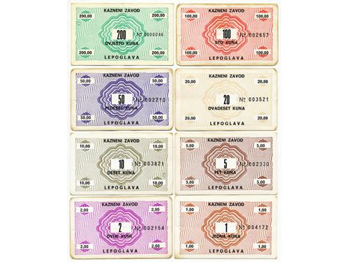Aukcija br. 67 - Numizmatika, militarija 121 - Hrvatska, zona B, Istra,Rijeka i Slovensko primorje, 50 lira bez serijskog broja VF-XF 350 EUR 122 - Hrvatska, zona B, Istra,Rijeka i Slovensko primorje, kompletan set 1, 5, 10, 20, 50, 100, 500, 1000 UNC + 50 lira crni broj u VF 2000 EUR 123 - LEPOGLAVA, kazneni zavod, izuzetno rijedak set bonova (13), 1, 5, 10, 20, 50 lipa, 1, 2, 5 ,10, 20, 50, 100, 200 kuna, VF-UNC, izuzetno rijetko 500 EUR 124 - Hrvatska, okupacijski novac takozvane "Republike srpske krajine" komplet SPECIMEN u originalnom pakiranju, ukupno 34 novčanice. rijetko, UNC 650 EUR 125 - Hrvatska, Republika, 5 Hrvatskih dinara 1991, serijska oznaka B1, UNC 125 EUR 126 - Hrvatska, Republika, 50.000 Hrvatskih dinara 1993., ZAMJENSKA - Z, izuzetno rijetko, UNC 150 EUR 127 - Bosna i Hercegovina, SARAJEVO 1 kruna/25 para, "TELEGRAM", vjerojatno najrjeđa B&H novčanica. Poznato nekoliko primjeraka, a ova je u najboljoj kvaliteti. -UNC 1500 EUR 128 - Bosna i Hercegovina, 10 dinara, 1.8.1992., SARAJEVO, UNC 50 EUR 129 - Bosna i Hercegovina, 20 dinara, 1.8.1992., SARAJEVO, UNC 50 EUR 130 - Bosna i Hercegovina, 50 dinara, 1.8.1992., SARAJEVO, UNC 30 EUR 131 - Bosna i Hercegovina, 500 dinara, 1.8.1992., SARAJEVO, UNC 80 EUR 132 - Bosna i Hercegovina, 1000 dinara, 1.8.1992., SARAJEVO, UNC 20 EUR ←67891011121314→