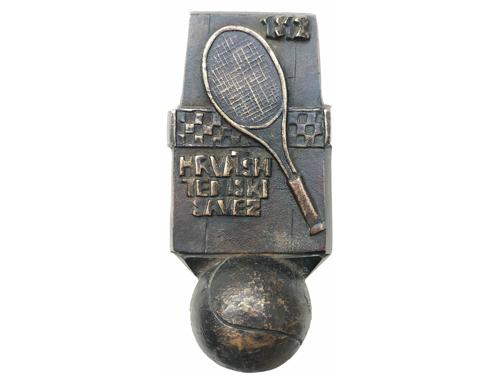 Aukcija br. 67 - Numizmatika, militarija 289 - BAHORIĆ, Belizar, medalja stajačica "Hrvatski teniski savez" 1997, AE - 2040 g, 80x160 mm 70 EUR 290 - Plaketa, nogomet (vjerojatno Osijek) za zasluge 1930, AE, 95x140 mm, rijetko 15 EUR 291 - HŠK "Uskok" medalja, "svom igraču" 1924, Sn, 56x150 mm 75 EUR 292 - ZAGREB, plaketa Zagrebački nogometni podsavez reprezentativnom igraču, cca 1930, AE emajl, 58x74 mm 60 EUR 293 - NOGOMET, medalja, HŠK "Ličanin" Zagreb, 1931, Huguenin, TB, 40 mm 35 EUR 294 - HNS - 1992. Zlatna plaketa dodijeljena poznatom sportskom novinaru Frediju Krameru, u originalnoj kutiji 30 EUR 295 - SRBIJA, Vojvodina, SUBOTICA medalja za prvaka provincije 1921/22, AE posrebreno, 34x50 mm, na originalnoj vrpci 17 EUR 296 - MAĐARSKA - JUGOSLAVIJA, medalja, utakmica 9. svibnja 1935., AE, 35 mm 20 EUR 297 - NOGOMET, medalja, Sub.(otički) N.P. svom prvaku 1930/31, Huguenin, TB, 50 mm 10 EUR 298 - NOGOMET, medalja, Sub.(otički) Nogometni podsavez svom prvaku 1929/30, Huguenin, TB, 50 mm 10 EUR 299 - FYLOP, Beck, VRŠAC - Vojvodina, medalja milenijske izložbe u Budimpešti 1896. godine na ime Hatz Vilmosnak iz Vršca, AE, 70 mm, oštećenja 20 EUR 300 - BEOGRAD, medalja veslačkog prvenstva Europe u Beogradu 1932 godine, AE, 70 mm 35 EUR ←202122232425262728→
