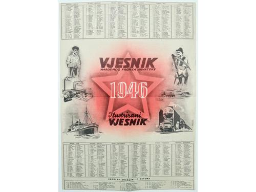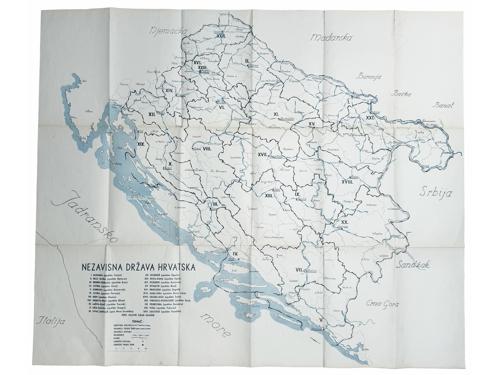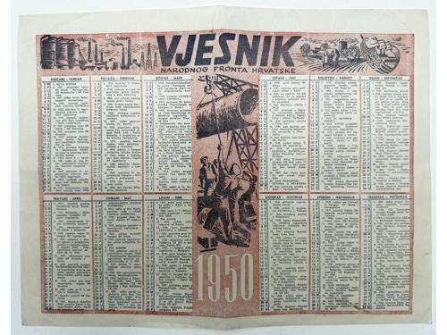 Aukcija br. 70 - Numizmatika, militarija Dokumenti, fotografije i ostalo 2291 - Hrvatske Zidne novine, Podmornice potapljaju. Prikaz vijesti o uspjehu podmornicama, Godina II, broj 21, Zagreb, 25. svibnja 1943. 340 EUR 2292 - Plakat, “ Prve bombe je bacila Englezka 12. siječnja 1940. na civilno pučanstvo". 1000 EUR 2293 - Plakat, “ Mrtvačka šuma kod Katyna” tako Sovjeti postupaju sa svojom slavenskom braćom. 1943. 2400 EUR 2294 - Plakat, "Što ti je draže: Miran rad ili boljševičko nasilje!". Izdavač: Propaganda Staffel Kroatien (PSK) 2000 EUR 2295 - FNRJ, Vjesnik Narodnog fronta Hrvatske - ilustrirani kalendar za 1946. 12 EUR 2296 - FNRJ, Vjesnik Narodnog fronta Hrvatske - ilustrirani kalendar za 1950. 8 EUR 2297 - HRVATSKA-SAD, plakat, međudržavna nogometna utakmica ZAGREB, 17. listopad 1990. 250 EUR 2298 - Zemljovid područja Slovenije, Hrvatske, B&H, Srbije, Crne Gore i Albanije iz 1906, dekorativno, 95x93,5 cm 14 EUR 2299 - Zemljovid Kraljevine Srba, Hrvata i Slovenaca s regijama oko 1920/25, izuzetno dekorativno, 94x79 cm 200 EUR 2300 - NDH, zemljovid podjele na župe i kotare s popisom svih 23 župa, 1941/43, dekorativno, 82x69 cm 50 EUR 2301 - NDH, zemljovid zapadnog Sredozemlja godine 1941/43 s kartom NDH i ostalih zemalja tog dijela Europe 30 EUR 2302 - HRVATSKA - putovnica oko 1820/30 godine, župa DUBROVNIK, vjerojatno najstarija putovnica na hrvatskom jeziku, 31x44 cm 160 EUR ←12345→