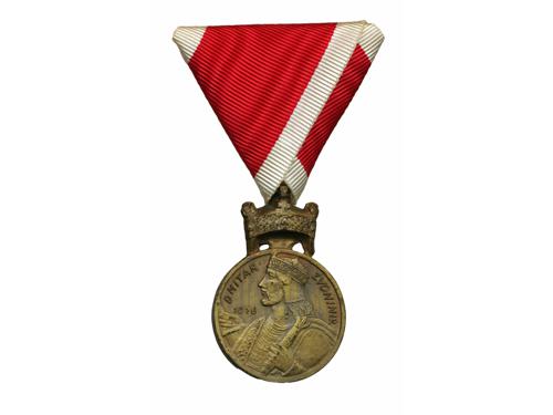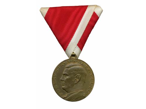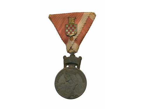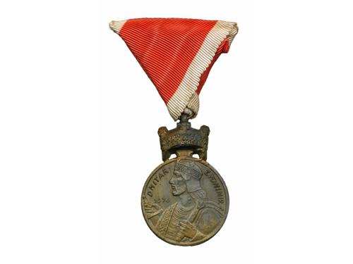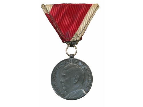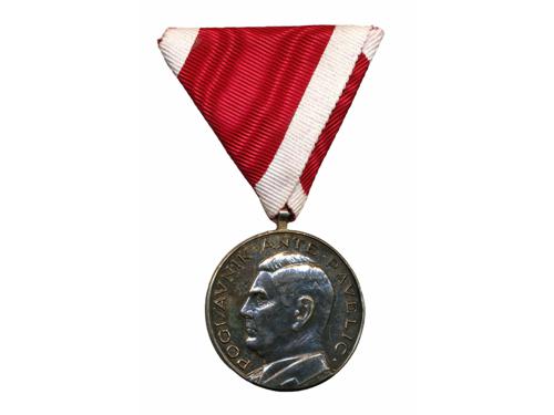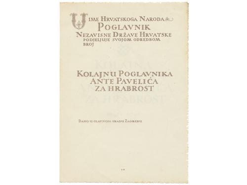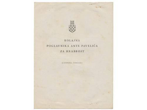 Aukcija br. 70 - Numizmatika, militarija Militarija 2236 - NDH 1941-1945, željezna medalja Krune Kralja Zvonimira na civilnoj vrpci (III. red) 160 EUR 2237 - NDH 1941-1945, željezna medalja Krune Kralja Zvonimira na ratnoj vrpci s hrvatskim grbom (III. red) 340 EUR 2238 - NDH 1941-1945, brončana medalja Krune Kralja Zvonimira na ratnoj vrpci (II. red) 160 EUR 2239 - NDH 1941-1945, brončana medalja Krune Kralja Zvonimira na ratnoj vrpci (II. red) 180 EUR 2240 - NDH 1941-1945, brončana medalja Ante Pavelića za hrabrost (II. red) 100 EUR 2241 - NDH 1941-1945, srebrna medalja Ante Pavelića za hrabrost (I. red), varijanta 44/45 u cinku, izvrsna 160 EUR 2242 - NDH 1941-1945, srebrna medalja Ante Pavelića za hrabrost (I. red), Ag puncirano TK i punca za srebro 160 EUR 2243 - NDH, Kruna Kralja Zvonimira, zvijezda I. reda s mačevima, punce za srebro i GK, izvrsna kvaliteta, izuzetno rijetko 1500 EUR 2244 - NDH 1941-1945, brončana medalja Ante Pavelića za hrabrost (II. red) VREĆICA za dodjelu na terenu, oštećena, izuzetno rijetko 220 EUR 2245 - NDH, zakonska odredba kolajne Ante Pavelića za hrabrost, 19x25 cm 100 EUR 2246 - NDH, originalni ukaz kolajne Ante Pavelića za hrabrost, neispunjen, 19x25 cm, izvrsna kvaliteta 100 EUR 2247 - NDH, dokument o dodjeli željeznog trolista IV. stupnja za hrabro držanje i uspješno vodstvo iz 13. listopada 1943., Originalni potpisi Ante Pavelića i Miroslava Navratila (ministar oružanih snaga NDH, 160 EUR ←123456→