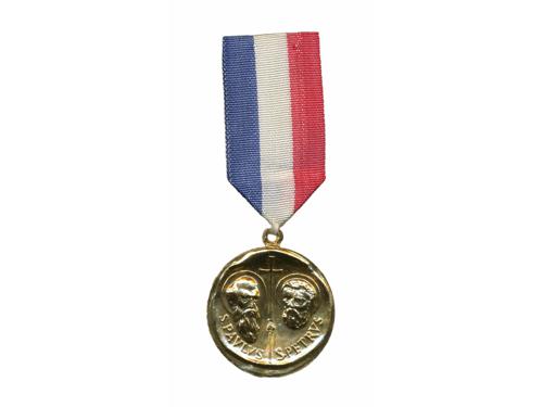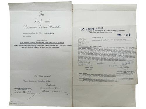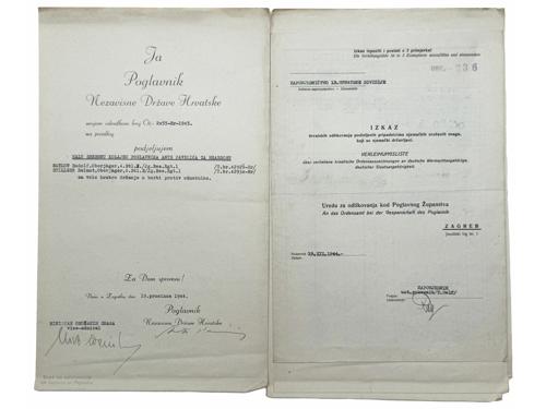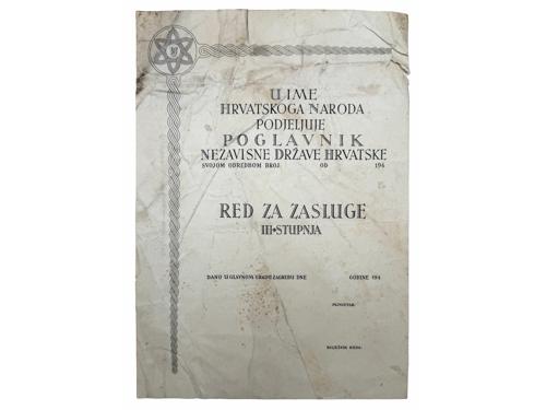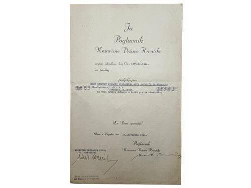 Aukcija br. 70 - Numizmatika, militarija Militarija 2248 - NDH, dokument o dodjeli mele srebrne kolajne AP za hrabrost iz 23. listopada 1944., Originalni potpisi Ante Pavelića i Nikole Steinfela (ministar oružanih snaga NDH) 60 EUR 2249 - NDH, ukaz za RED ZA ZASLUGE III red, neispunjen, više oštećenja 170 EUR 2250 - NDH, kompletan spis o dodjeli mele srebrne kolajne AP za hrabrost iz 4. siečnja 1945., Originalni potpisi Ante Pavelića i Nikole Steinfela (ministar oružanih snaga NDH) 80 EUR 2251 - NDH, kompletan spis o dodjeli mele srebrne kolajne AP za hrabrost iz 19.prosinca 1944., Originalni potpisi Ante Pavelića i Nikole Steinfela (ministar oružanih snaga NDH) 80 EUR 2252 - NDH, pješadijski bodež, svi dijelovi originalni, remenčići za nošenje, jako lijepa kvaliteta, Braća KNAUS Zagreb 1200 EUR 2253 - HRVATSKO hodočešće u Rim 1967, medalja, Al pozlaćeno, izuzetno rijetko 25 EUR 2254 - HRVATSKA, Republika, spomen medalja "OLUJA", ME, 40 mm 30 EUR 2255 - HRVATSKA, Republika, kopča za remen, brončana 4 EUR 2256 - HRVATSKA, Republika, kopča za remen, srebrna 4 EUR 2257 - HRVATSKA, Republika, kopča za remen, brončana 8 EUR 2258 - HRVATSKA, Republika, kopča za remen, srebrna 8 EUR 2259 - HRVATSKA, Republika, kopča za remen, zlatna 8 EUR ←123456→