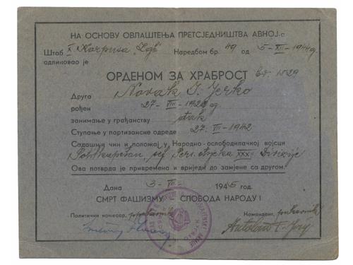 Aukcija br. 70 - Numizmatika, militarija Militarija 2272 - MAČ ČASNIKA KOPNENE VOJSKE, Kraljevina SHS/Jugoslavija, proizvodnja: SORLINI, 1930te. 450 EUR 2273 - SRBIJA, Jugoslavenski narodni pokret ZBOR (Ljotićevci), oznaka, na papučicu, uz oznaku i dva otvorena pisma dr. Antonu Korošcu. 500 EUR 2274 - Jugoslavija, Socijalistička, orden za hrabrost I. (ruski) tip, broj 2479, varijanta s plastificiranom vrpcom 40 EUR 2275 - JUGOSLAVIJA, potvrda-ukaz za nošenje ordena za hrabrost, 1945, 162x125 mm 16 EUR 2276 - JUGOSLAVIJA, socijalistička, značka, "Streljački savez Jugoslavije", IKOM - Zagreb, rijetko, 20x22 mm 30 EUR 2277 - JNA, oznaka zrakoplovne (vazduhoplovne) akademije, IKOM Zagreb 170 EUR 2278 - JNA, oznaka mornarice, utisnuti redni broj 2751, IKOM Zagreb 16 EUR ←123456