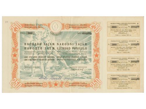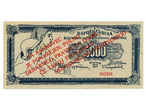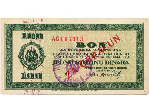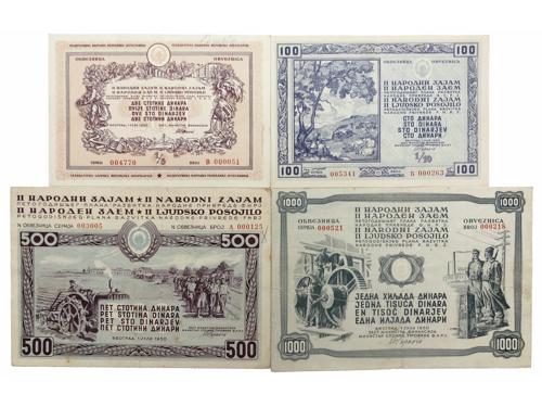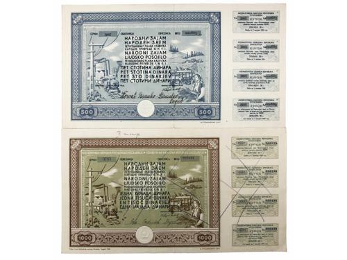 Aukcija br. 70 - Numizmatika, militarija Papirni novac - Socijalistička Jugoslavija 2103 - Jugoslavija, socijalistička, robna doznačnica, lot (2) 50 i 500 dinara, UNC 8 EUR 2104 - Jugoslavija, socijalistička, 1951, BON ZA OTKUP, lot (6) 1, 2, 5, 10, 20, 100 dinara, VF-XF 50 EUR 2105 - Jugoslavija, socijalistička, 1951, TURISTIČKI BON, lot (4) 1, 2, 5, 10 dinara, VF-XF 80 EUR 2106 - Jugoslavija, socijalistička, 1951, TURISTIČKI BON, 5 dinara, UNC 20 EUR 2107 - Jugoslavija, socijalistička, 1951, ZEMUN, uprava radnog - koncentracijskog logora, set 1, 2, 5, 10, 50, 100 dinara UNC 35 EUR 2108 - Jugoslavija, socijalistička, 1951, ZEMUN, abonentski bon za logor, set 5, 10, 20, 50 dinara aUNC 55 EUR 2109 - SFR Jugoslavija, 5000 dinara 1955, SLOVENIJA - propagandni letak, aUNC 10 EUR 2110 - FNR Jugoslavija, 100 dinara bon za oficirsku opremu, žig vojna pošta KORČULA, XF, izuzetno rijetko 50 EUR 2111 - Jugoslavija, socijalistička, Narodni zajam, 1.7.1948, 250 dinara, s originalnim kuponima, 28x15 cm 140 EUR 2112 - Jugoslavija, socijalistička, Narodni zajam, 1.7.1948, lot (2), 500 i 1000 dinara, s originalnim kuponima, 31x17 cm 140 EUR 2113 - Jugoslavija, socijalistička, Narodni zajam, 1.7.1950. lot (4), 100, 200, 500, 1000 DINARA, F - VF (1000 dinara jače zaderana) 25 EUR 2114 - Jugoslavija, socijalistička, Narodni zajam, 28.10.1963. SPECIMEN A000000, lot (7), 1000, 2000, 5000, 10000, 50000, 100000, 500000 DINARA, aUNC 160 EUR ←12