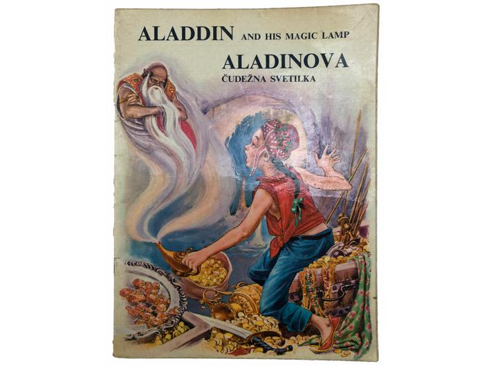 Opis: Čedomir Jović (dramatizirao i preveo na engleski) / Alenka Moder (prevela na slovenski): Aladdin and his magic lamp - Aladinova čudežna svetilka, zgodbo iz Tisoč in ene noči. Beograd, Nolit i Ljubljana, Cankarjeva založba. Slikovnica na engleskom i slovenskom jeziku. Meki uvez, 20 str. od toga 2 str. rječnika, stanje odlično. 24x32 cm