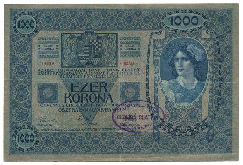 Opis: 1000 kruna Slovenija Kraljevina SHS, Austrija, pretisak ŽUPANSTVO OKOLICA SLATINA okraj. glav. Ptuj