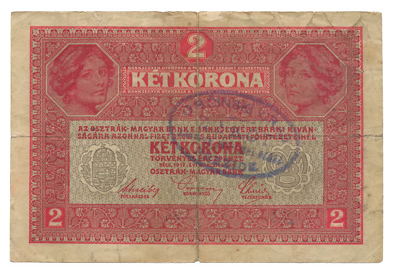 Opis: 2 krune Slovenija Kraljevina SHS, Austrija, pretisak ZAKOT / OBČINSKI URAD okraj BREŽICE