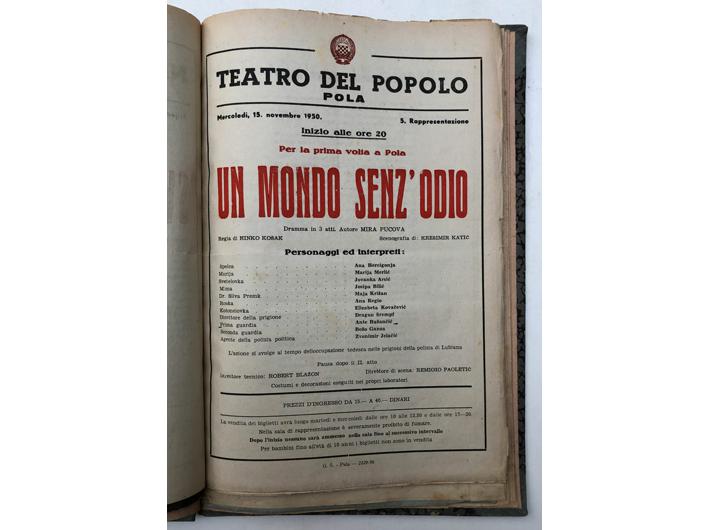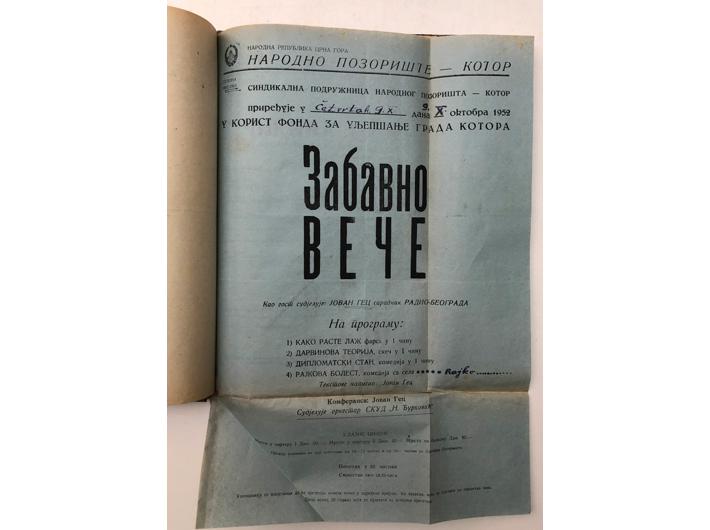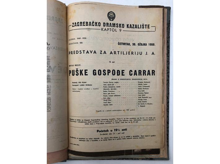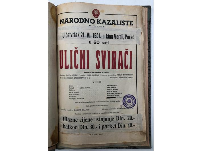 Opis: 48 PLAKATA kazališta u Zagrebu, Puli i Kotoru. 1948-53. Ukupno 48 uvezanih plakata: 5 plakata Zagrebačkog dramskog kazališta (1948/49; 1949/50), 33 plakata Narodnog kazališta Pula (1950/51; 1951/52) i 10 plakata Narodnog pozorišta Kotor (1952/53). Tvrdi uvez, 22x32 cm. Stanje odlično.