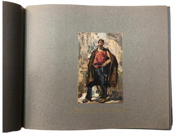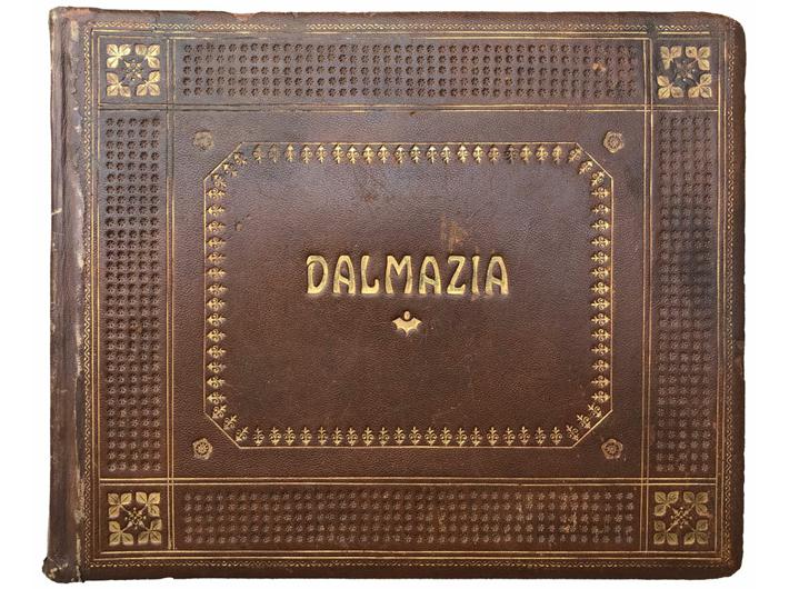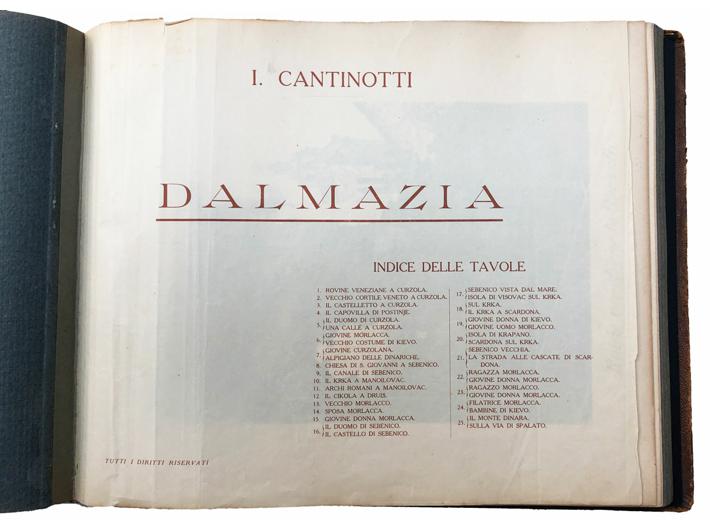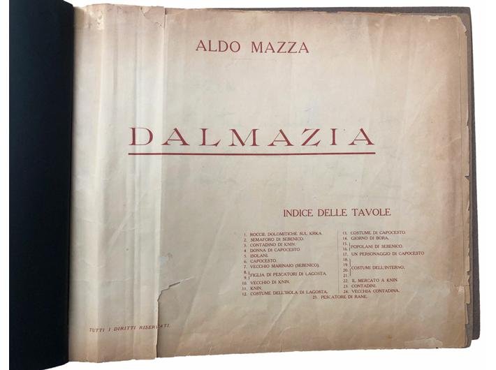 Opis: Aldo Mazza: Dalmazia, Oreste Pizio: Dalmazia, I. Cantinotti: Dalmazia. 1919. Talijanski guverner Dalmacije, admiral Millo, pozvao je 1919. trojicu istaknutih talijanskih slikara (Cantinotti, Pizio, Mazza) da dođu u Dalmaciju i naslikaju svoje utiske. Sva trojica objavili su albume krajolika i ljudi s oko 25 slika. Sve tri mape su uvezane zajedno. Bibliofilsko izdanje, mapa u koži sa zlatopisom, dimenzija 31x25 cm. Vrlo rijetko!