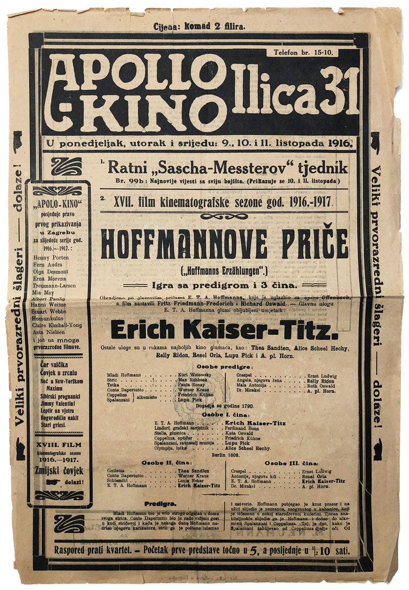 APOLLO - KINO Ilica 31, Zagreb, plakat za filmsku predstavu "Hoffmannove priče" iz 1916. Opis: APOLLO - KINO Ilica 31, Zagreb, plakat za filmsku predstavu "Hoffmannove priče" iz 1916. Vrlo rijetko! 29x43 cm APOLLO - KINO Ilica 31, Zagreb, plakat za filmsku predstavu "Hoffmannove priče" iz 1916. Aukcija: Aukcija br. 65 - Knjige, zemljovidi, plakati Kataloški broj: 994 Kategorija: Plakati, reklame, fotografije Trenutna ponuđena cijena je 30EUR, ukoliko želite dati svoju ponudu ona mora biti barem 35EUR ili veća. Upišite vrijednost vaše ponude: Ostali predmeti iz kategorije: Plakati, reklame, fotografije 994 30 EUR 995 10 EUR 996 160 EUR 997 150 EUR 998 250 EUR 999 25 EUR 1000 3000 EUR 1001 30 EUR 1002 20 EUR 1003 15 EUR 1004 15 EUR 1005 15 EUR 1006 20 EUR 1007 15 EUR 1008 15 EUR 1009 5 EUR 1010 7 EUR 1011 8 EUR 1012 10 EUR 1013 10 EUR 123→