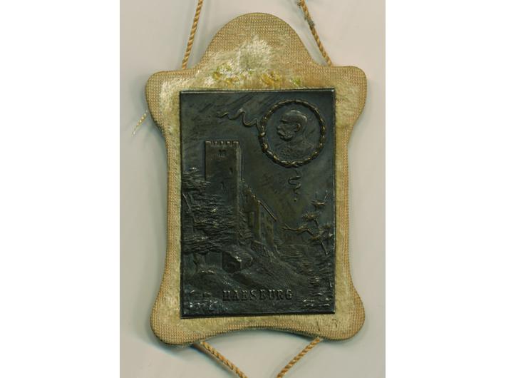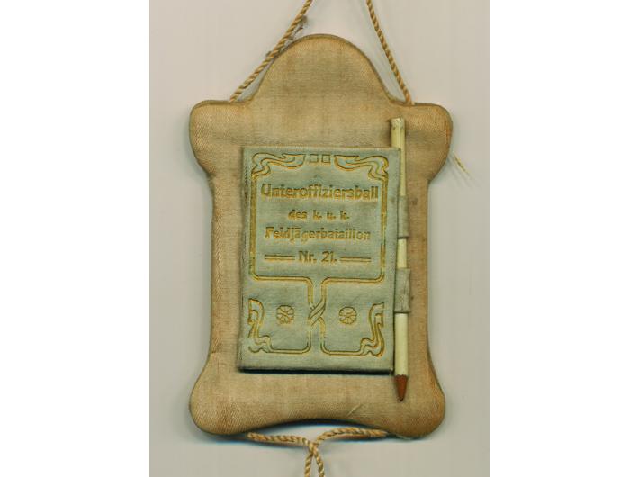 Opis: Austro-Ugarska, 21. feldjeger regimenta (Mitrovica-Srijem), pozivnica za oficirski bal, na poleđini F.Joseph i utvrda Habsburg (danas u Švicarskoj). Izrađeno iz tkanine, mala olovčica, a pozadina od metala.
