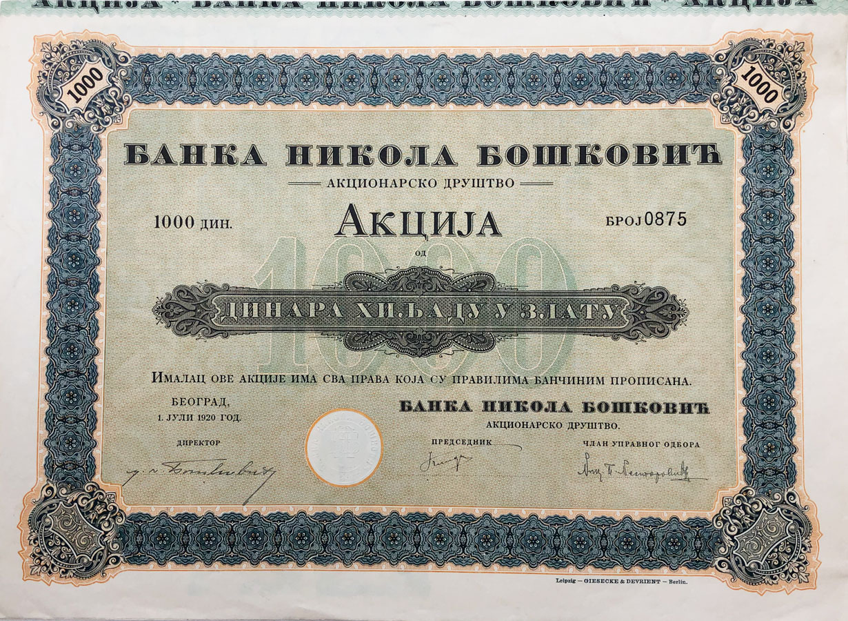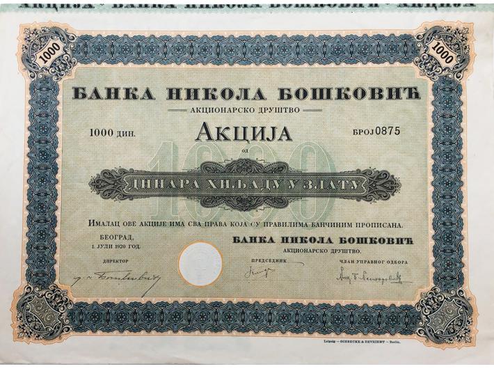 BEOGRAD, dionica “BANKA NIKOLA BOŠKOVIĆ A. D.", 1000 dinara u zlatu, 01. lipanj 1920., 35x25 cm Opis: BEOGRAD, dionica “BANKA NIKOLA BOŠKOVIĆ A. D.", 1000 dinara u zlatu, 01. lipanj 1920., 35x25 cm BEOGRAD, dionica “BANKA NIKOLA BOŠKOVIĆ A. D.", 1000 dinara u zlatu, 01. lipanj 1920., 35x25 cm Aukcija: Aukcija br. 67 - Numizmatika, militarija Kataloški broj: 216 Kategorija: Dionice - Srbija Trenutna ponuđena cijena je 15EUR, ukoliko želite dati svoju ponudu ona mora biti barem 17EUR ili veća. Upišite vrijednost vaše ponude: Ostali predmeti iz kategorije: Dionice - Srbija 216 15 EUR 217 15 EUR