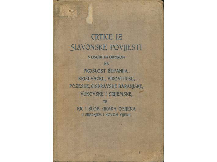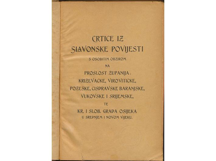 Opis: Bosendorfer, Josip: Crtice iz slavonske povijesti s osobitim obzirom na prošlost županija: Križevačke, Virovitičke, Požeške, Cisdravske Baranjske, Vukovarske i Srijemske te kr. i slob. grada Osijeka u srednjem i novom vijeku, Tiskom knjigo i kamenotiskare Julija Pfeiffera, Osijek, 1910., tvrdi uvez, 18×26,5 cm, str. 428. Sadrži kartu Donje Slavonije u srednjem vijeku, dimenzija 85x50 cm..