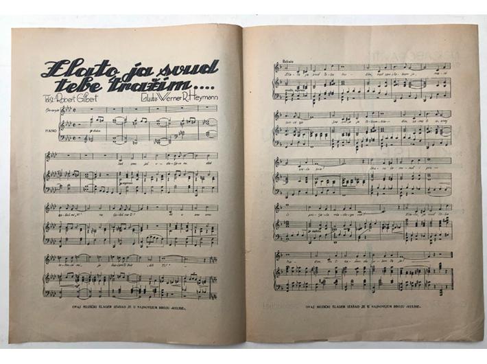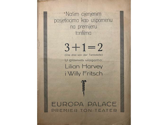 Opis: DIE DREI VON DER TANKSTELLE (prevedeno kao: 3+1=2), letak dobiven na premijeri filma u EUROPA PALACE kinu. Zagreb, 1930. Letak izrađen za premijeru mjuzikla u kojem glume Lilian Harvey i Willy Fritsch. Letak sadrži note i prevedeni tekst za pjesmu iz filma za koju je tekst napisao Robert Gilbert, a glazbu skladao Werner R. Haymann. Pjesma u prijevodu nosi naziv "Zlato ja svud tebe tražim". Stanje odlično.