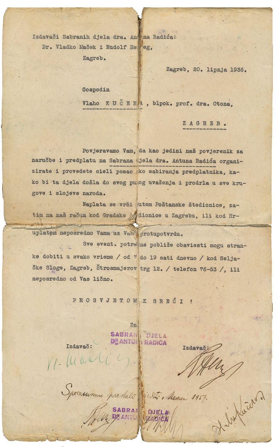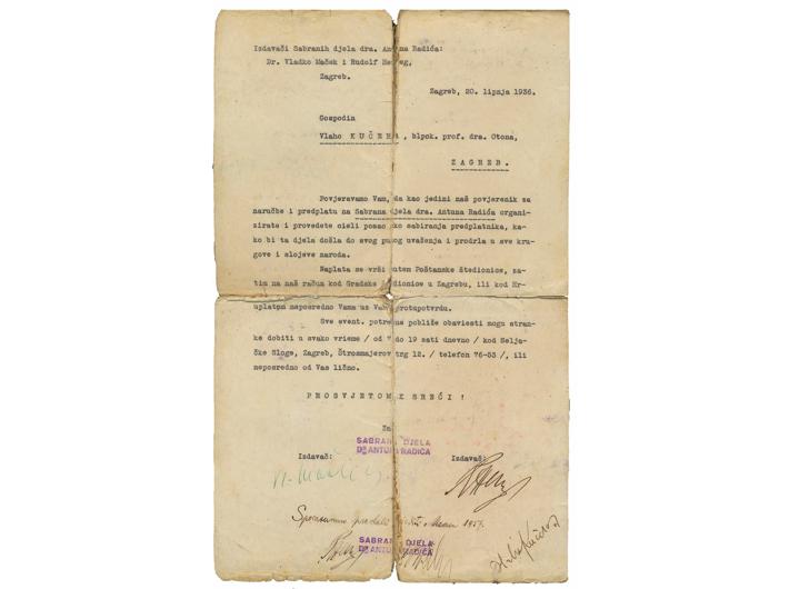 Dopis gosp. Vlahu Kučeri od izdavača sabranih djela dra. Antuna Radića, dr. Vladka Mačeka i Rudolfa Hercega s vlastoručnim potpisima. Zagreb, 1936-1937. Opis: Dopis gosp. Vlahu Kučeri od izdavača sabranih djela dra. Antuna Radića, dr. Vladka Mačeka i Rudolfa Hercega s vlastoručnim potpisima. Zagreb, 1936-1937. Kaširano na platno, presavijeno, stanje dobro. Rijetko! Dopis gosp. Vlahu Kučeri od izdavača sabranih djela dra. Antuna Radića, dr. Vladka Mačeka i Rudolfa Hercega s vlastoručnim potpisima. Zagreb, 1936-1937. Aukcija: Aukcija br. 64 - Numizmatika, militarija Kataloški broj: 535 Kategorija: Dokumenti i ostalo Trenutna ponuđena cijena je 15EUR, ukoliko želite dati svoju ponudu ona mora biti barem 15EUR ili veća. Upišite vrijednost vaše ponude: Ostali predmeti iz kategorije: Dokumenti i ostalo 531 60 EUR 532 100 EUR 533 12 EUR 534 10 EUR 535 15 EUR 536 15 EUR 537 7 EUR 538 30 EUR 539 15 EUR 540 15 EUR 541 20 EUR 542 5 EUR 543 60 EUR 544 100 EUR 545 60 EUR 546 35 EUR 547 8 EUR 548 10 EUR 549 18 EUR 550 60 EUR 123→