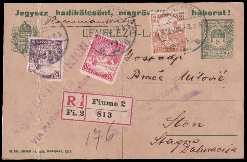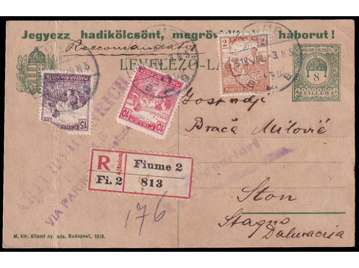 Dopisnica preporučeno upućena iz Rijeke u Ston 03.07. 1918. Opis: Dopisnica preporučeno upućena iz Rijeke u Ston 03.07. 1918. Cenzurirano po vojnoj cenzuri u Rijeci. Marka 15 fill. oštećena i preko nje vidljiv okomiti trag savijanja. Dopisnica preporučeno upućena iz Rijeke u Ston 03.07. 1918. Aukcija: Aukcija br. 63 - Filatelija i razglednice Kataloški broj: 80 Kategorija: Hrvatska do 1918 Kvaliteta: ✉ Trenutna ponuđena cijena je 14EUR, ukoliko želite dati svoju ponudu ona mora biti barem 14EUR ili veća. Upišite vrijednost vaše ponude: Ostali predmeti iz kategorije: Hrvatska do 1918 ✉ 22 50 EUR ✉ 23 25 EUR ✉ 24 25 EUR ✉ 25 18 EUR ✉ 26 25 EUR ✉ 27 25 EUR ✉ 28 20 EUR ✉ 29 60 EUR ☉ 30 65 EUR ▲ 31 14 EUR ▲ 32 20 EUR ▲ 33 20 EUR ☉ 34 16 EUR ☉ 35 12 EUR ☉ 36 12 EUR ☉ 37 20 EUR ☉ 38 65 EUR ☉ 39 18 EUR ✉ 40 12 EUR ▲ 41 12 EUR 1234→