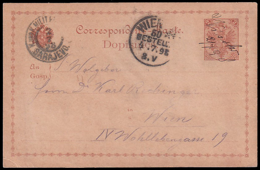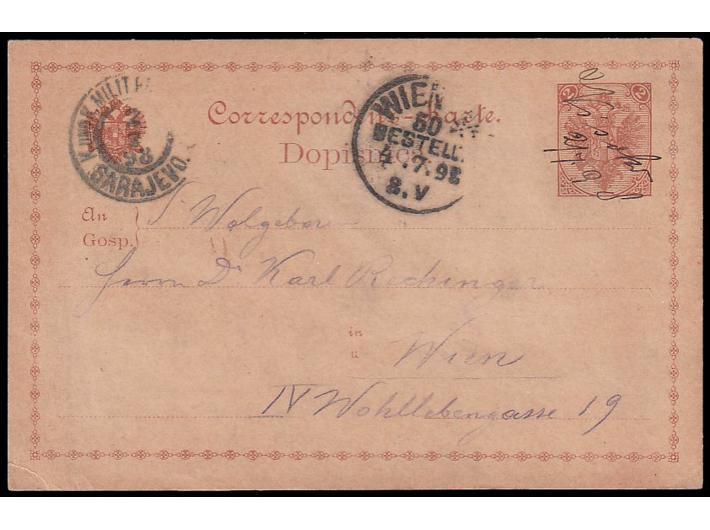 Dopisnica ručno poništena Visoko 2/7. 98 i upućena u Beč preko Sarajeva.
