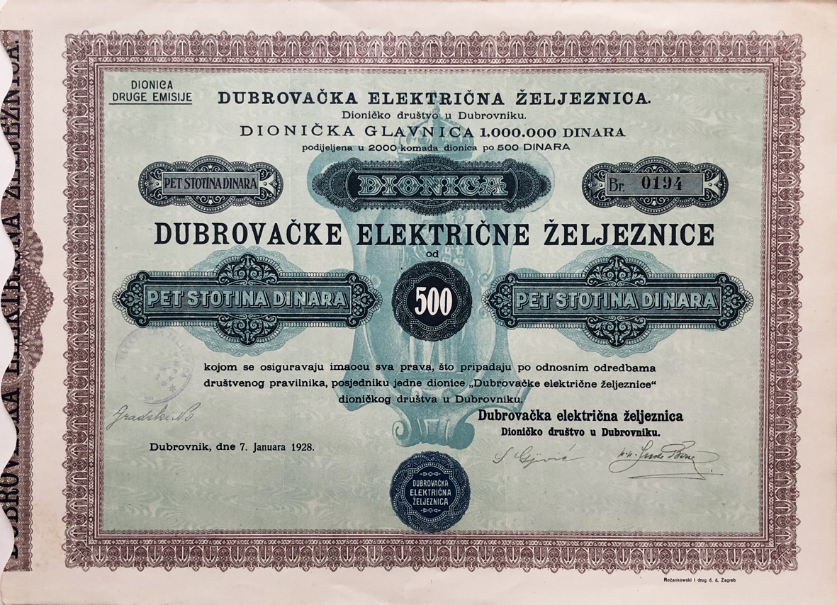 DUBROVNIK, dionica "Dubrovačka električna željeznica", 500 dinara, 7.1.1928., 35x25 cm Opis: DUBROVNIK, dionica "Dubrovačka električna željeznica", 500 dinara, 7.1.1928., 35x25 cm DUBROVNIK, dionica "Dubrovačka električna željeznica", 500 dinara, 7.1.1928., 35x25 cm Aukcija: Aukcija br. 64 - Numizmatika, militarija Kataloški broj: 356 Kategorija: Dionice - Hrvatska Trenutna ponuđena cijena je 15EUR, ukoliko želite dati svoju ponudu ona mora biti barem 17EUR ili veća. Upišite vrijednost vaše ponude: Ostali predmeti iz kategorije: Dionice - Hrvatska 335 80 EUR 336 40 EUR 337 35 EUR 338 15 EUR 339 30 EUR 340 20 EUR 341 30 EUR 342 100 EUR 343 60 EUR 344 10 EUR 345 8 EUR 346 18 EUR 347 20 EUR 348 12 EUR 349 30 EUR 350 10 EUR 351 15 EUR 352 22 EUR 353 15 EUR 354 8 EUR 12→