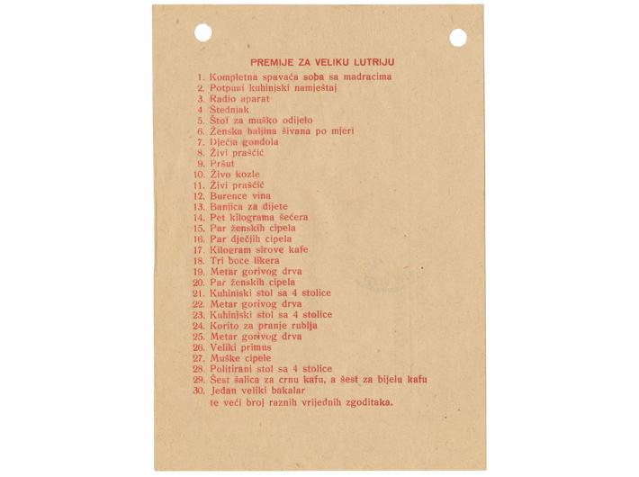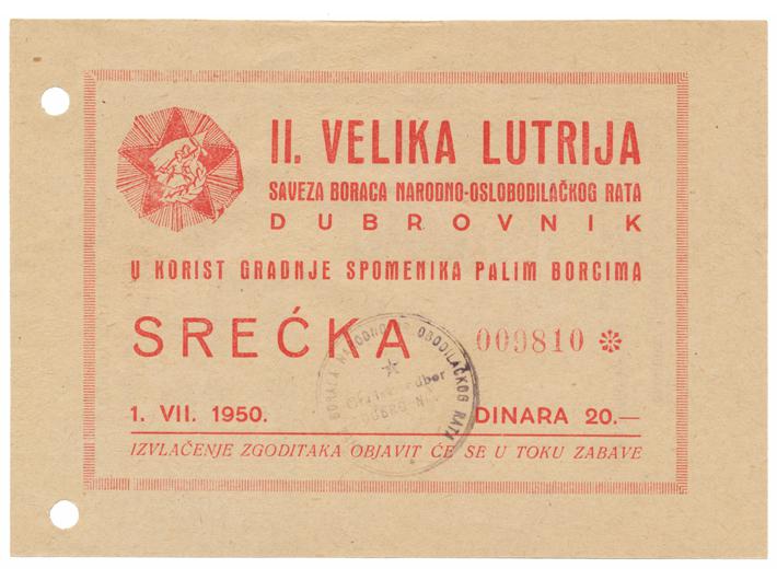 DUBROVNIK, lutrija za spomenik palim borcima, 1950, 148x104 mm Opis: DUBROVNIK, lutrija za spomenik palim borcima, 1950, 148x104 mm DUBROVNIK, lutrija za spomenik palim borcima, 1950, 148x104 mm Aukcija: Aukcija br. 70 - Numizmatika, militarija Kataloški broj: 2125 Kategorija: Lutrije Trenutna ponuđena cijena je 6EUR, ukoliko želite dati svoju ponudu ona mora biti barem 7EUR ili veća. Upišite vrijednost vaše ponude: Ostali predmeti iz kategorije: Lutrije 2124 25 EUR 2125 6 EUR 2126 6 EUR