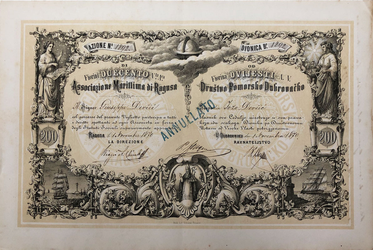 DUBROVNIK-RAGUSA, dionica “DRUŠTVO POMORSKO DUBROVAČKO” d.d., 200 fiorina, 1.11.1870., 39x26 cm Opis: DUBROVNIK-RAGUSA, dionica “DRUŠTVO POMORSKO DUBROVAČKO” d.d., 200 fiorina, 1.11.1870., 39x26 cm DUBROVNIK-RAGUSA, dionica “DRUŠTVO POMORSKO DUBROVAČKO” d.d., 200 fiorina, 1.11.1870., 39x26 cm Aukcija: Aukcija br. 70 - Numizmatika, militarija Kataloški broj: 2128 Kategorija: Dionice - Hrvatska Trenutna ponuđena cijena je 90EUR, ukoliko želite dati svoju ponudu ona mora biti barem 95EUR ili veća. Upišite vrijednost vaše ponude: Ostali predmeti iz kategorije: Dionice - Hrvatska 2127 220 EUR 2128 120 EUR 2129 70 EUR 2130 30 EUR 2131 65 EUR 2132 60 EUR 2133 18 EUR 2134 16 EUR 2135 20 EUR 2136 30 EUR 2137 50 EUR 2138 30 EUR 2139 18 EUR 2140 30 EUR 2141 16 EUR 2142 16 EUR 2143 10 EUR 2144 25 EUR 2145 10 EUR 2146 65 EUR 12→