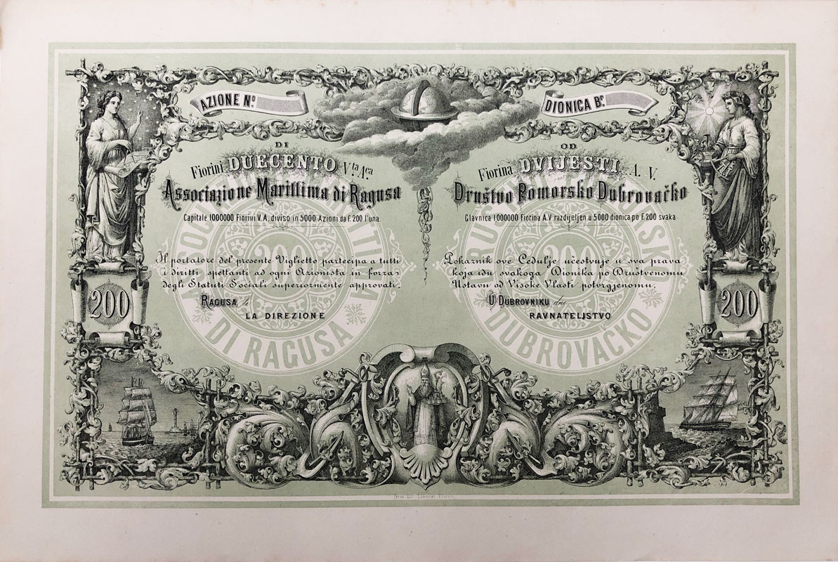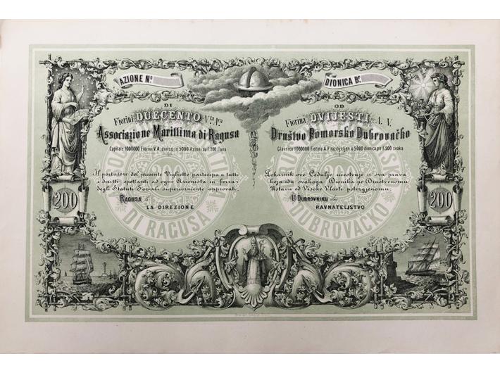 DUBROVNIK-RAGUSA, dionica “DRUŠTVO POMORSKO DUBROVAČKO” d.d., 200 fiorina, na donosioca, 1870. 39x26 cm Opis: DUBROVNIK-RAGUSA, dionica “DRUŠTVO POMORSKO DUBROVAČKO” d.d., 200 fiorina, na donosioca, 1870. 39x26 cm DUBROVNIK-RAGUSA, dionica “DRUŠTVO POMORSKO DUBROVAČKO” d.d., 200 fiorina, na donosioca, 1870. 39x26 cm Aukcija: Aukcija br. 70 - Numizmatika, militarija Kataloški broj: 2127 Kategorija: Dionice - Hrvatska Trenutna ponuđena cijena je 170EUR, ukoliko želite dati svoju ponudu ona mora biti barem 180EUR ili veća. Upišite vrijednost vaše ponude: Ostali predmeti iz kategorije: Dionice - Hrvatska 2127 220 EUR 2128 120 EUR 2129 70 EUR 2130 30 EUR 2131 65 EUR 2132 60 EUR 2133 18 EUR 2134 16 EUR 2135 20 EUR 2136 30 EUR 2137 50 EUR 2138 30 EUR 2139 18 EUR 2140 30 EUR 2141 16 EUR 2142 16 EUR 2143 10 EUR 2144 25 EUR 2145 10 EUR 2146 65 EUR 12→