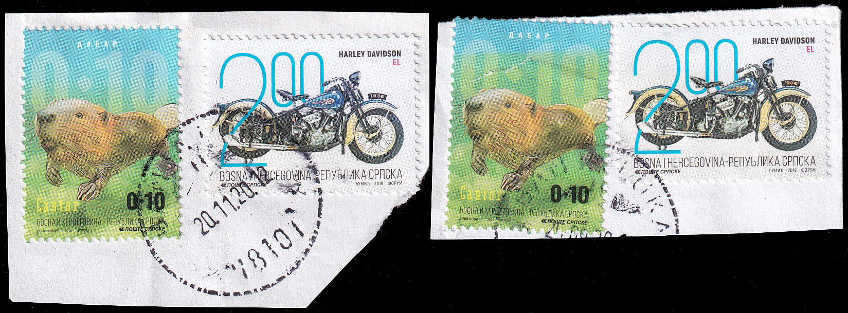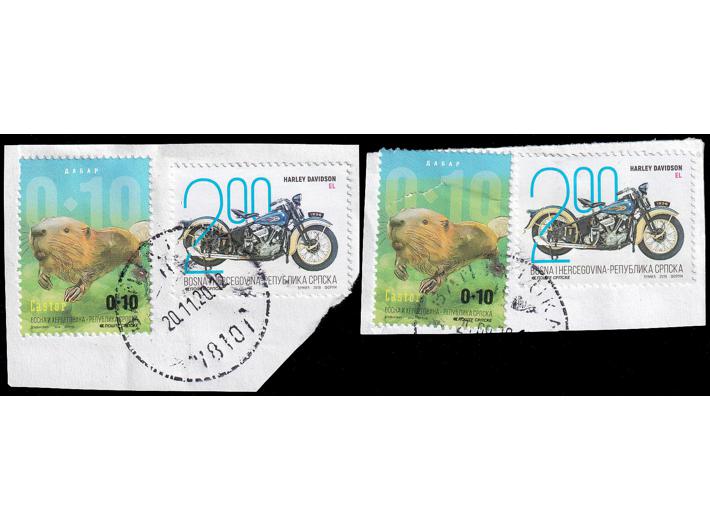 • Dva isječka s markom dabar i pogreškom tiska, preljev iz zelene u plavu boju u gornjem dijelu marke