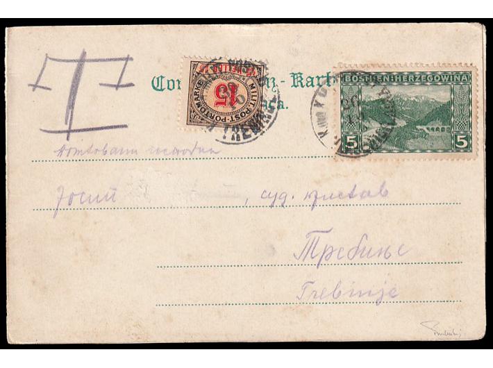 Dvostruka razglednica Vlasenice upućena 20.10. 1909. u Trebinje i u dolasku portirana s 15 hellera. Opis: Dvostruka razglednica Vlasenice upućena 20.10. 1909. u Trebinje i u dolasku portirana s 15 hellera. Zanimljiva kombinacija, paraf Raybaudi, dobra kvaliteta. Dvostruka razglednica Vlasenice upućena 20.10. 1909. u Trebinje i u dolasku portirana s 15 hellera. Aukcija: Aukcija br. 63 - Filatelija i razglednice Kataloški broj: 681 Kategorija: Bosna i Hercegovina Kvaliteta: ✉ Trenutna ponuđena cijena je 40EUR, ukoliko želite dati svoju ponudu ona mora biti barem 40EUR ili veća. Upišite vrijednost vaše ponude: Ostali predmeti iz kategorije: Bosna i Hercegovina * 618 100 EUR * 619 40 EUR ** 620 45 EUR ** 621 200 EUR * 622 40 EUR **/* 623 120 EUR * 624 150 EUR ** 625 25 EUR * 626 50 EUR ** 627 50 EUR ** 628 40 EUR * 629 30 EUR * 630 30 EUR **/* 631 70 EUR * 632 100 EUR * 633 40 EUR ** 634 60 EUR * 635 20 EUR * 636 20 EUR ** 637 25 EUR 1234→