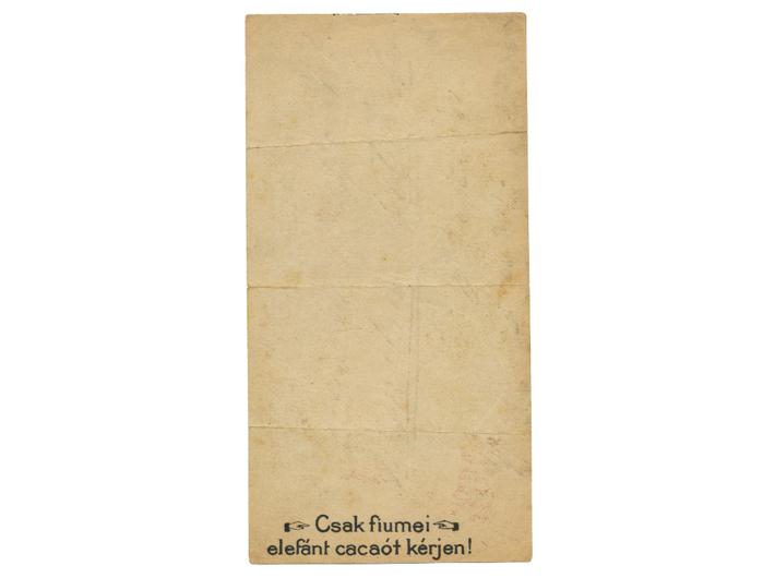 Opis: FIUMEI Cacao és Csokoládé – Gyár, reklamni listić, oko 1900. Riječka tvornica kakaa i čokolade. Tisak u boji, vrlodobra kvaliteta. 7x13,5 cm