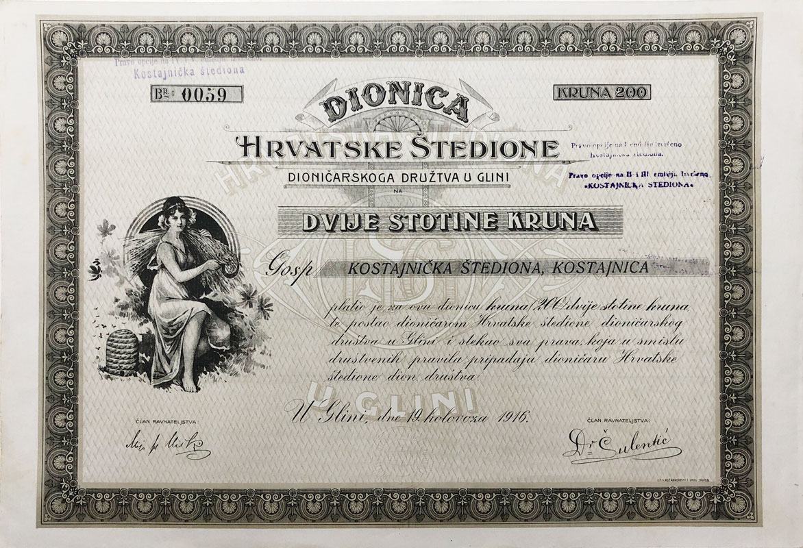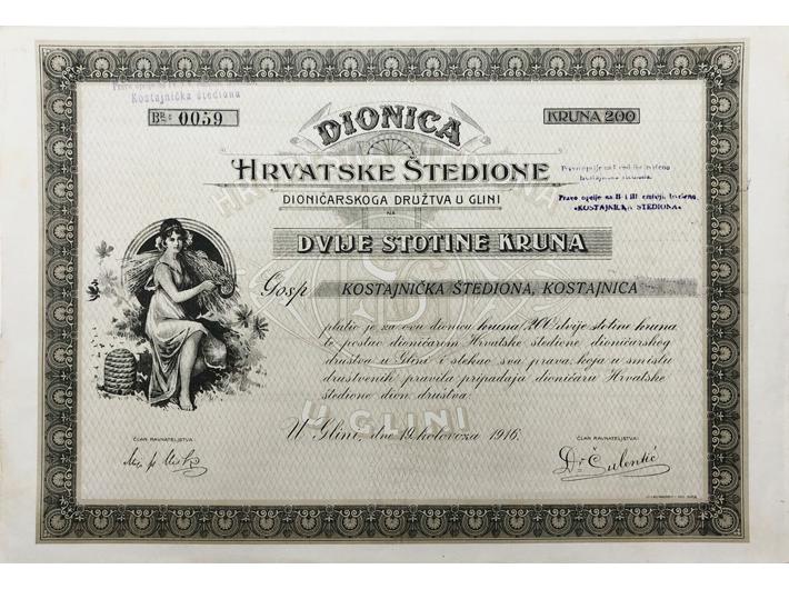 • GLINA, dionica "HRVATSKA ŠTEDIONICA" d.d., 200 kruna, 19. kolovoz 1916., 39x26,5 cm