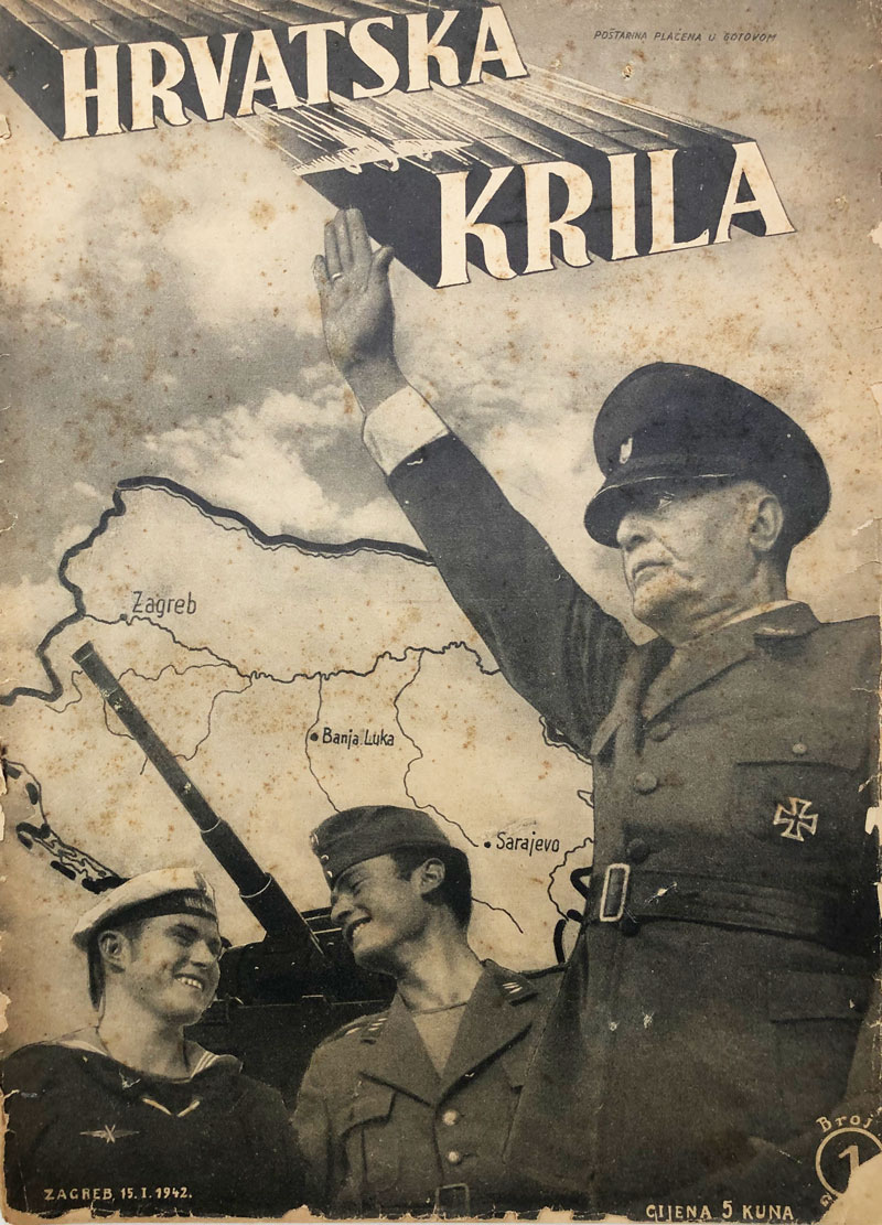 Opis: HRVATSKA KRILA br. 1/1942. Hrvatska krila je bio časopis zapovjedništva zračnih snaga Nezavisne Države Hrvatske koji je od jeseni 1941. do 1945. izlazio svakih petnaest dana (polumjesečnik). Časopis je raznim proslovima i fotografskim izvještajima pratio svakodnevni život, praktičnu obuku i borbeno djelovanje hrvatskih zrakoplovaca, a uz to je znatan prostor posvećen promidžbi zrakoplovstva, zrakoplovne tehnike i sportskog zrakoplovstva.