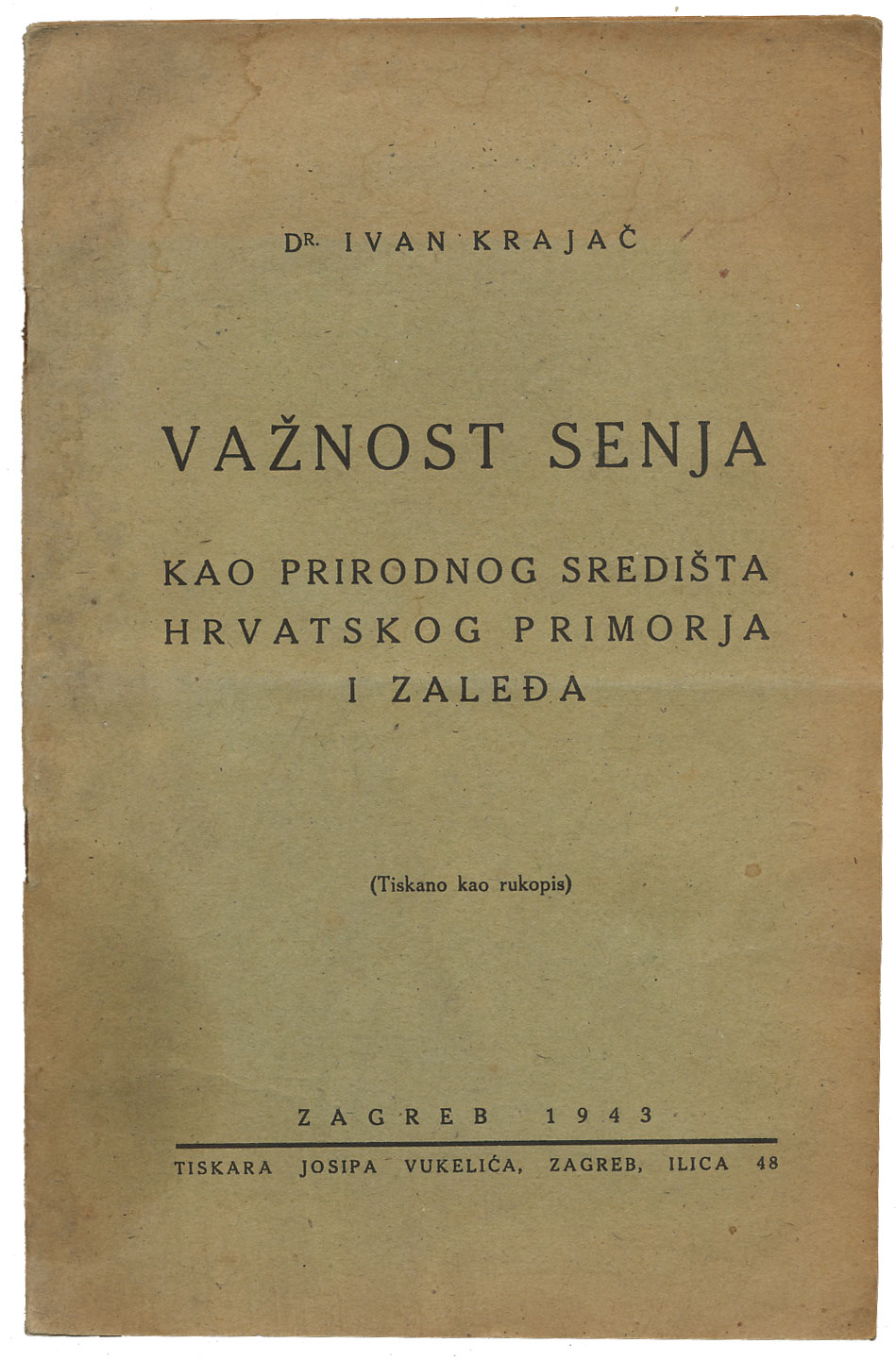 Ivan Krajač: Važnost Senja. Zagreb, tiskara Josipa Vukelića, 1943. Opis: Ivan Krajač: Važnost Senja. Zagreb, tiskara Josipa Vukelića, 1943. Brošura o Senju kao prirodnom središtu Hrvatskog Primorja i zaleđa. Meki uvez, 21 str, 15,5x23,5 cm. Stanje odlično. Ivan Krajač: Važnost Senja. Zagreb, tiskara Josipa Vukelića, 1943. Aukcija: Aukcija br. 65 - Knjige, zemljovidi, plakati Kataloški broj: 1071 Kategorija: Rijeka i Kvarner Trenutna ponuđena cijena je 16EUR, ukoliko želite dati svoju ponudu ona mora biti barem 16EUR ili veća. Upišite vrijednost vaše ponude: Ostali predmeti iz kategorije: Rijeka i Kvarner 1059 70 EUR 1060 70 EUR 1061 30 EUR 1062 25 EUR 1063 150 EUR 1064 50 EUR 1065 10 EUR 1066 50 EUR 1067 160 EUR 1068 40 EUR 1069 22 EUR 1070 65 EUR 1071 16 EUR 1072 40 EUR 1073 35 EUR 1074 40 EUR 1075 50 EUR 1076 70 EUR 1077 40 EUR 1078 15 EUR 12→