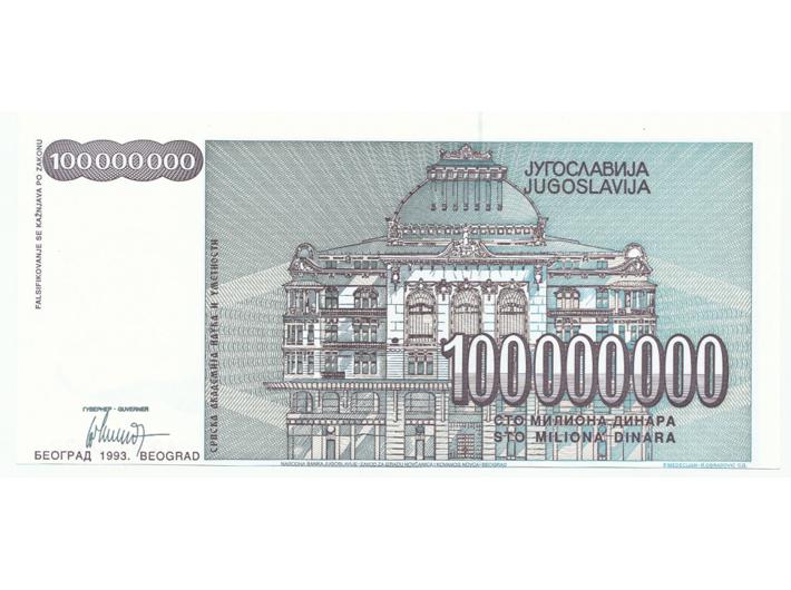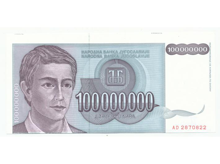• JUGOSLAVIJA, 100.000.000 dinara 1993., GREŠKA - autori D.Andrić i N.Hrvanović na vrhu novčanice, UNC, rijetko