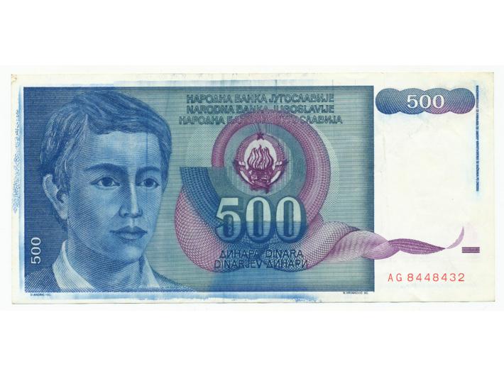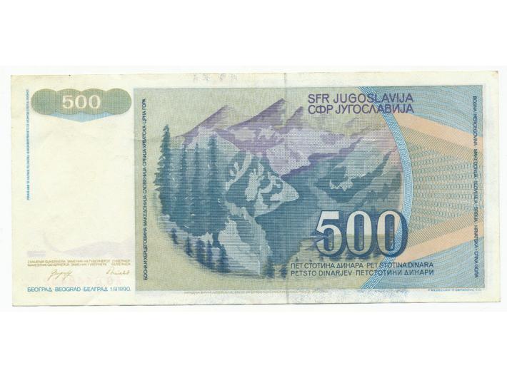Opis: JUGOSLAVIJA, 500 dinara 1990., GREŠKA - razlivena plava boja, XF, rijetko