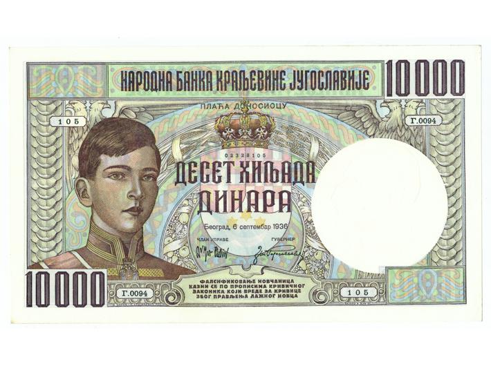 JUGOSLAVIJA, Kraljevina 10000 dinara 1936, UNC Opis: JUGOSLAVIJA, Kraljevina 10000 dinara 1936, UNC JUGOSLAVIJA, Kraljevina 10000 dinara 1936, UNC Aukcija: Aukcija br. 67 - Numizmatika, militarija Kataloški broj: 148 Kategorija: Papirni novac - Kraljevina Jugoslavija Trenutna ponuđena cijena je 3200EUR, ukoliko želite dati svoju ponudu ona mora biti barem 3200EUR ili veća. Upišite vrijednost vaše ponude: Ostali predmeti iz kategorije: Papirni novac - Kraljevina Jugoslavija 137 35 EUR 138 35 EUR 139 260 EUR 140 50 EUR 141 70 EUR 142 8 EUR 143 8 EUR 144 10 EUR 145 8 EUR 146 8 EUR 147 55 EUR 148 3200 EUR