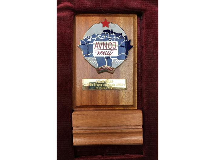 • Jugoslavija, Plaketa AVNOJ-a 1983, za preživjele učesnike II. zasjedanja AVNOJA. Izuzetna rijetkost (samo 32 delegata dobila su ovu plaketu). Dodijeljena narodnom heroju D.Š. ( na aukciji RAUH 89/201