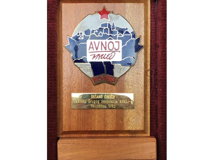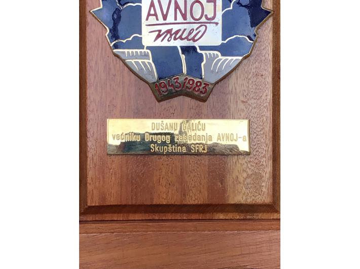 Jugoslavija, Plaketa AVNOJ-a 1983, za preživjele učesnike II. zasjedanja AVNOJA. Izuzetna rijetkost (samo 32 delegata dobila su ovu plaketu). Dodijeljena narodnom heroju D.Š. ( na aukciji RAUH 89/201