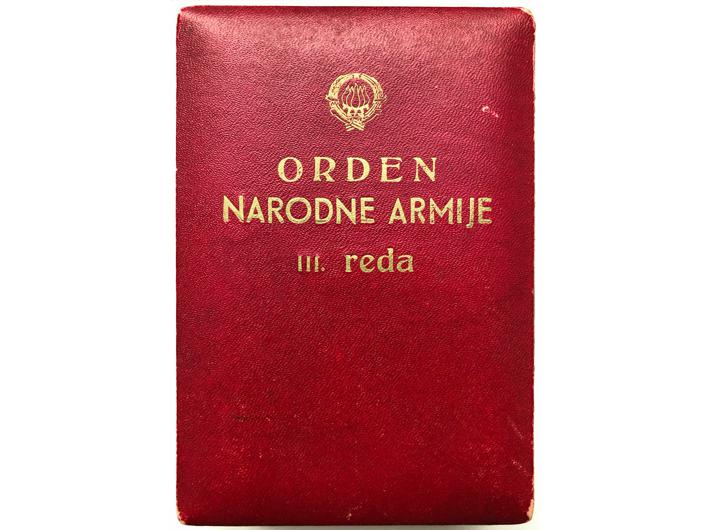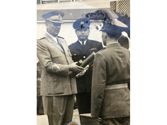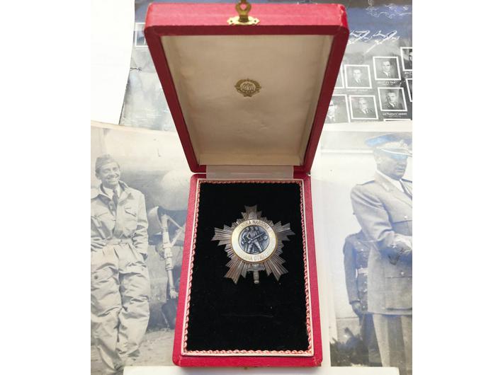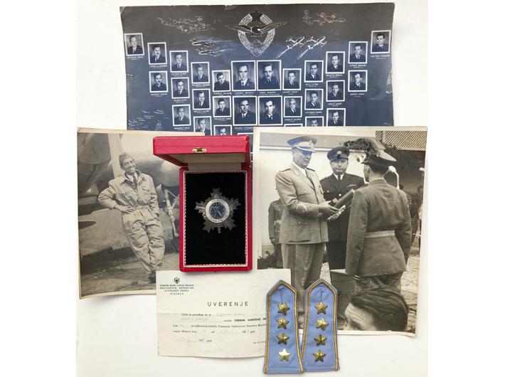 Opis: JUGOSLAVIJA, socijalistička, lot, Dejanović Savo, zrakoplovni major, orden narodne armije III reda u kutiji s papirom dodjele iz 1958., zrakoplovne epolete kapetana I. klase, fotografija Tita kako predaje Savi orden 238x300 mm, velika zajednička fotografija pilota JNA 390x290 mm, fotografija Savo uz avion 178x238 mm, izvrstan i zanimljiv lot.