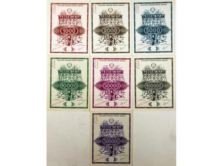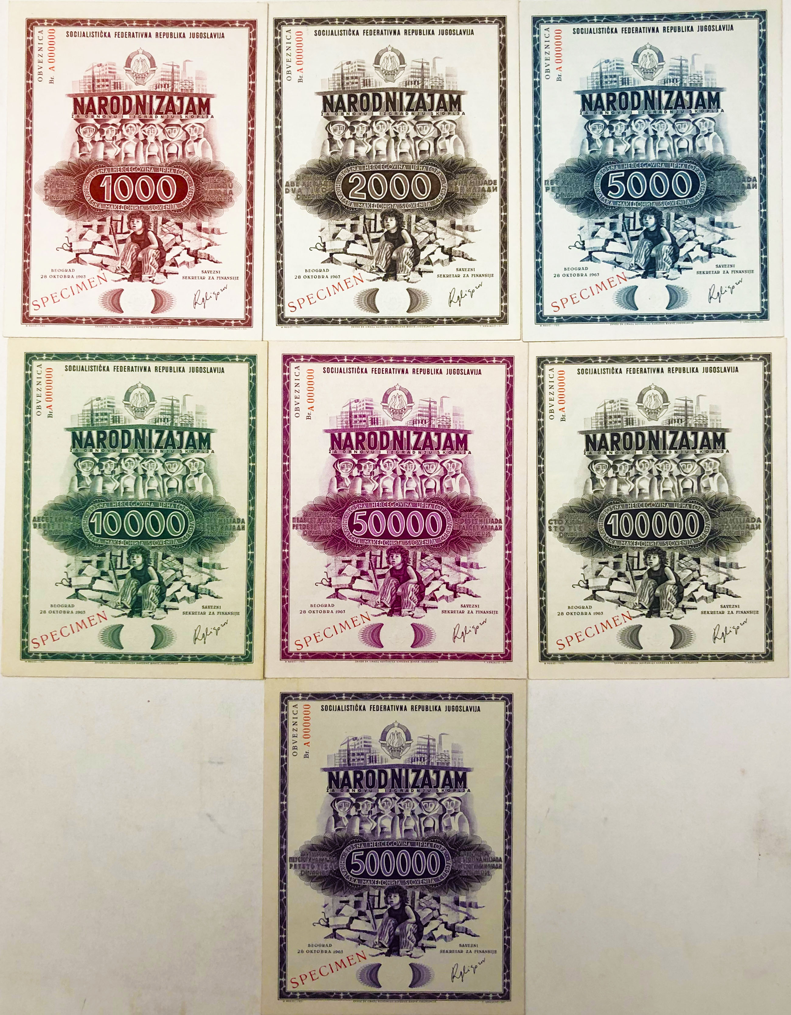 • Jugoslavija, socijalistička, Narodni zajam, 28.10.1963. SPECIMEN A000000, lot (7), 1000, 2000, 5000, 10000, 50000, 100000, 500000 DINARA, aUNC