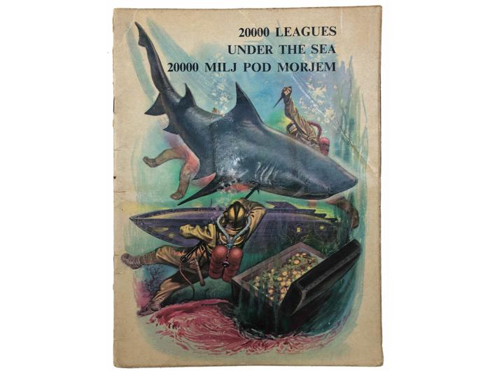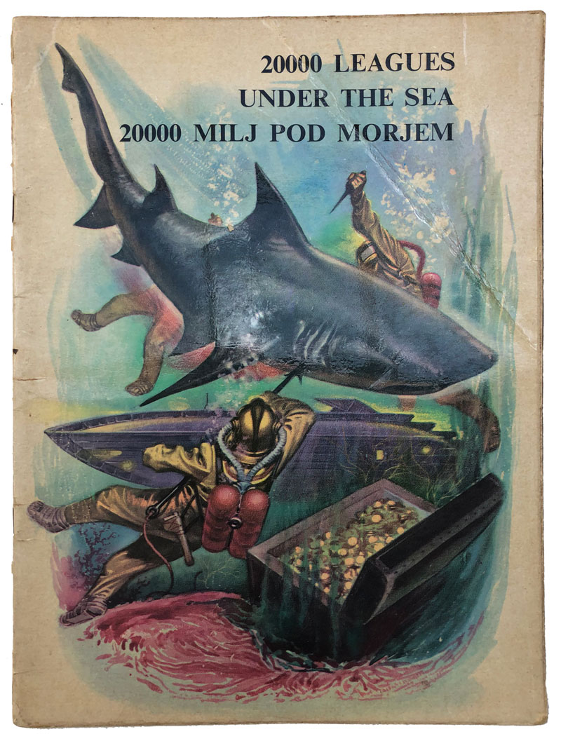 Opis: Jules Verne / Čedomir Jović (dramatizirao i preveo na engleski) / Alenka Moder (prevela na slovenski): 20000 leagues under the sea - 20000 milj pod morjem. Beograd, Nolit i Ljubljana, Cankarjeva založba. Slikovnica na engleskom i slovenskom jeziku. Meki uvez, 22 str. od toga 4 str. rječnika, stanje odlično. 24x32 cm