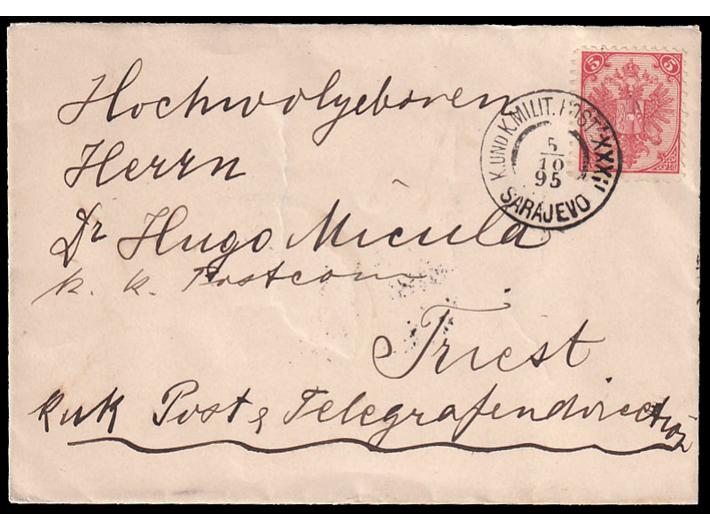 Opis: Koverta manjeg formata s ukrasnom ilustracijom na poleđini upućena iz Sarajeva u Trst 05.10. 1895. Dolaz na poleđini. Odlična kvaliteta.