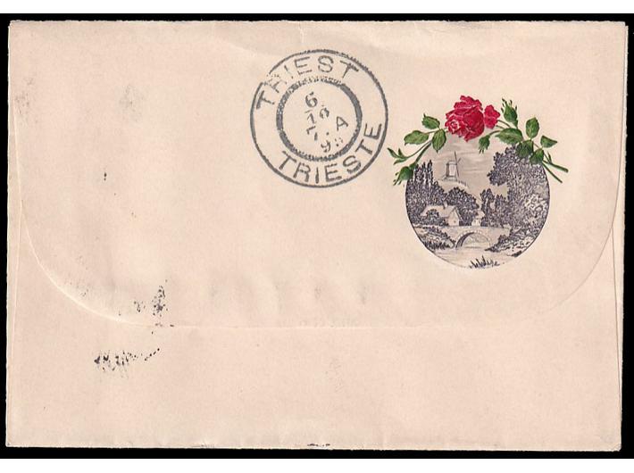 Koverta manjeg formata s ukrasnom ilustracijom na poleđini upućena iz Sarajeva u Trst 05.10. 1895.