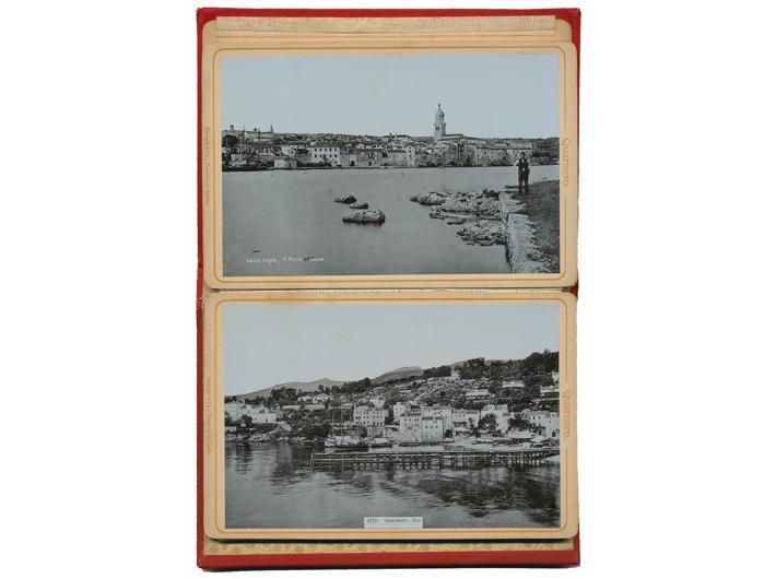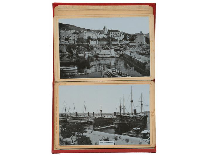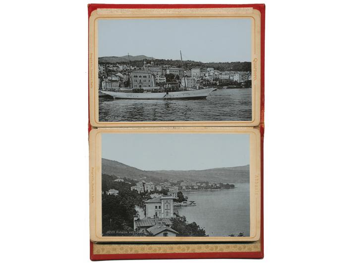 Opis: KVARNER, laporello album s 12 fotografija. Panorame Rijeke, Bakra, Crikvenice, Opatije, Krka, Lovrana, Pule, Lošinja i dr., oko 1900. Secesijski uvez, stanje vrlodobro.