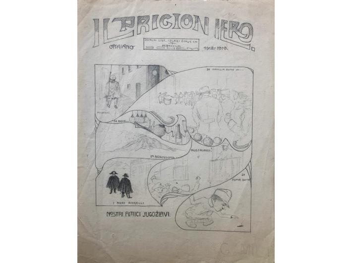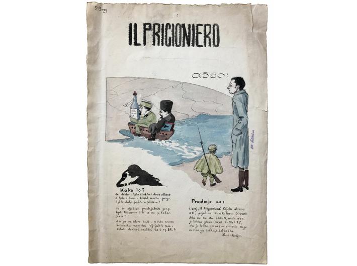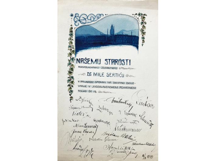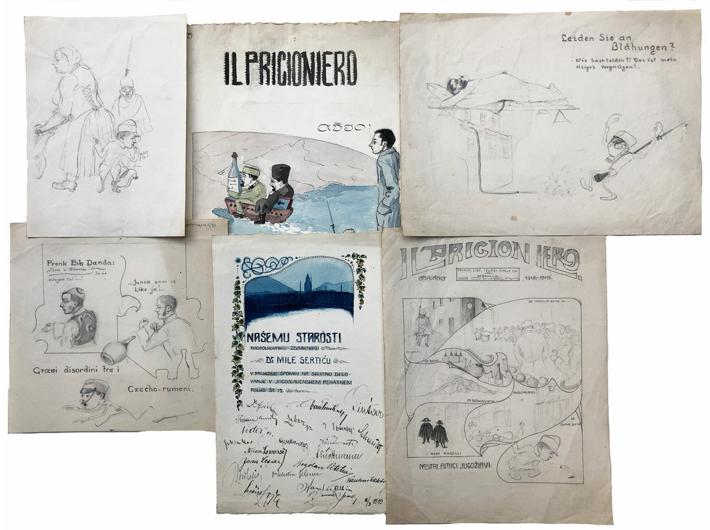 Opis: Lot: Čestitka general-liječniku jugoslavenske vojske Mili Sertiću (1871.-1949.) + 5 crteža za neobjavljeni časopis "Il pricioniero". Slovenija, 1919. Jedinstvena naslikana čestitka podpukovniku Dr. Mili Sertiću: "...u znak sjećanja na zajedničko djelovanje u 17. jugoslavenskoj pješačkoj pukovniji". Na dnu sadrži 21 potpis čestitara. Mile Sertić bio je general-liječnik, časnik austrougarske vojske, kasnije vojske Kraljevine Jugoslavije do 1930. Od lipnja 1941. do rujna 1942. nadzornik sveukupne zdravstvene službe Ministarstva hrvatskog domobranstva. Uz čestitku priloženo 5 originalnih karikaturnih crteža za vjerojatno nikad objavljen političko-karikaturni časopis "Il pricioniero" (1918-1919). Čestitka i crteži vjerojatno od istog autora.