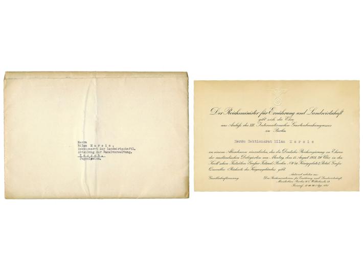 Opis: Lot dokumenata na ime Milan Maršić predstavnika Kraljevine Jugoslavije na skupu u Njemačkoj koji je organiziralo ministarstvo prehrane i poljo-
