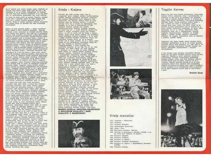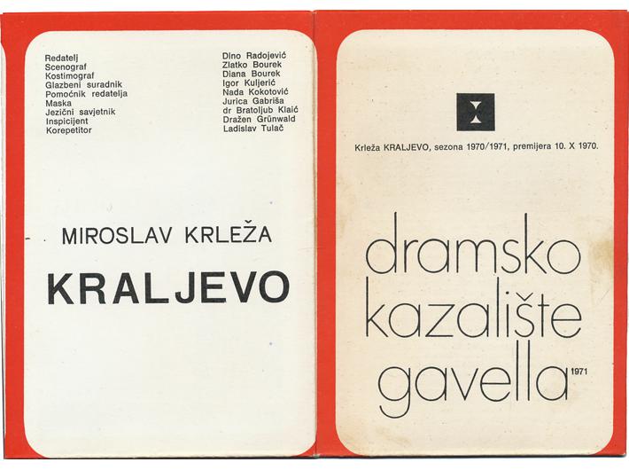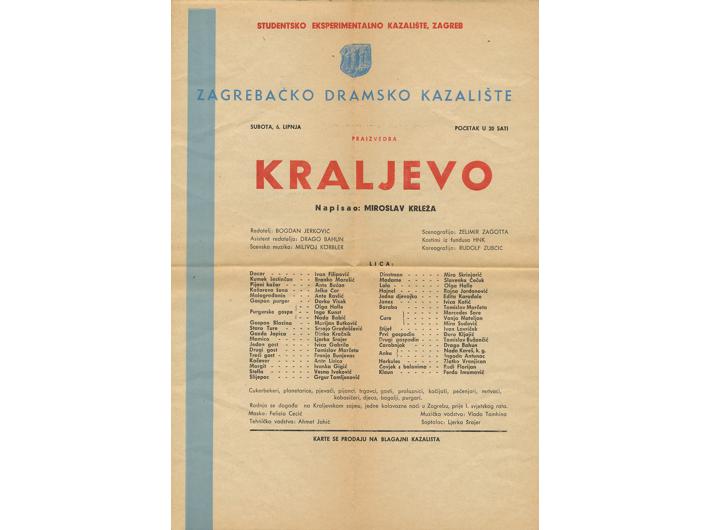 Opis: Lot, dva programa za dramsku premijeru "Kraljevo" Miroslava Krleže; plakat (21x29,5 cm) za predstavu redatelja Bogdana Jerkovića iz 1959. za SEK Zagreb i program za premijeru iz 1970. redatelja Dine Radojevića za izvedbu u dramskom kazalištu Gavella Zagreb. Stanje odlično.