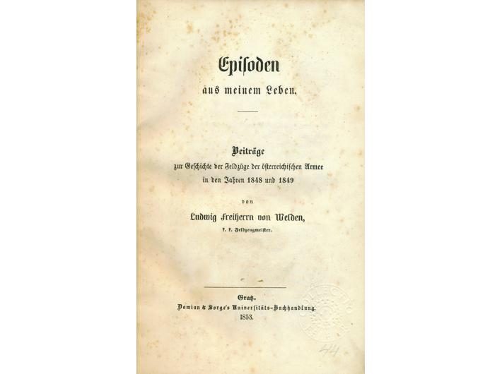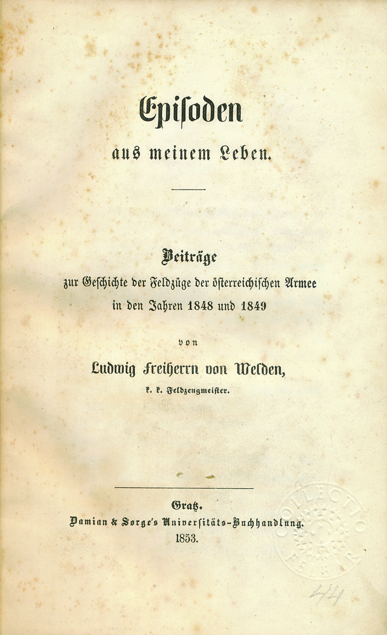 Ludwig Freiherr von Welden: Episoden aus meinem Leben. Beiträge zur Geschichte der Feldzüge der österreichischen Armee in den Jahren 1848 und 1849. Gratz, 1853. Prvo izdanje.