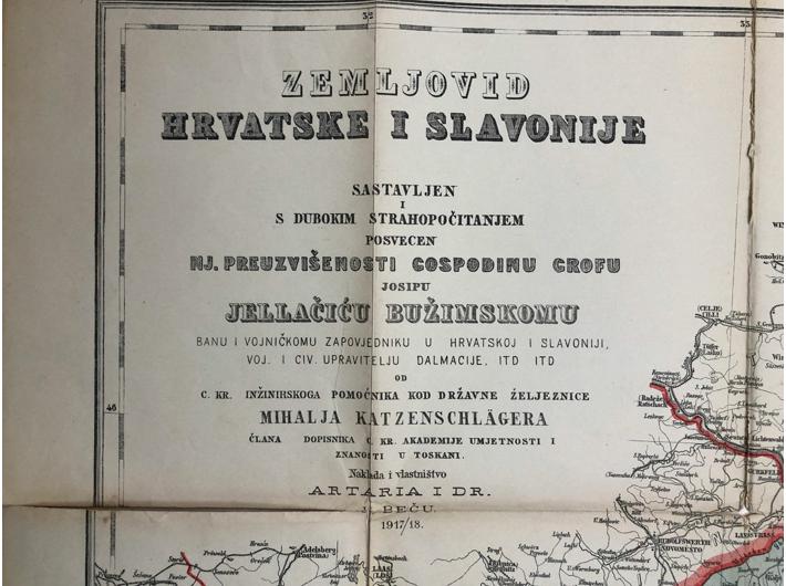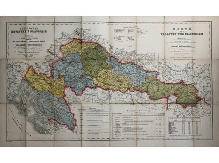 Opis: M. Katzenschläer: Generalkarte Kroazien und Slavonien/Zemljovid Hrvatske i Slavonije. Wien/Beč: Artria & Comp., 1919. Pregledao K. Peucker. Preklopna karta. Administrativna i politička karta Hrvatske i Slavonije posvećena Banu Josipu Jelačiću. Mjerilo: 1:500,000, 63x110 cm. Stanje dobro.